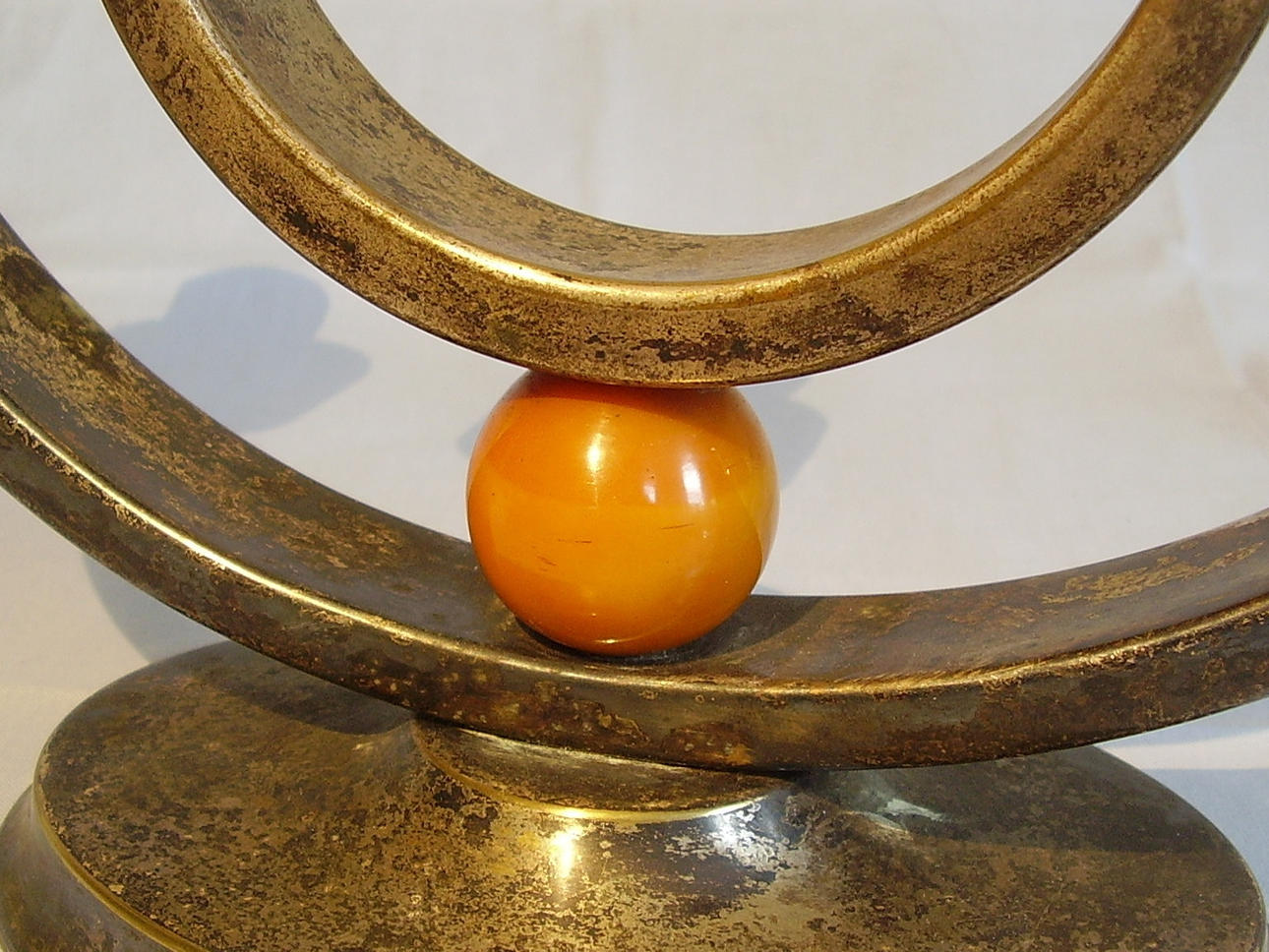 Una gran esfera de baquelita de ámbar pulido está firmemente montada entre los brazos de la araña en forma de cinta.