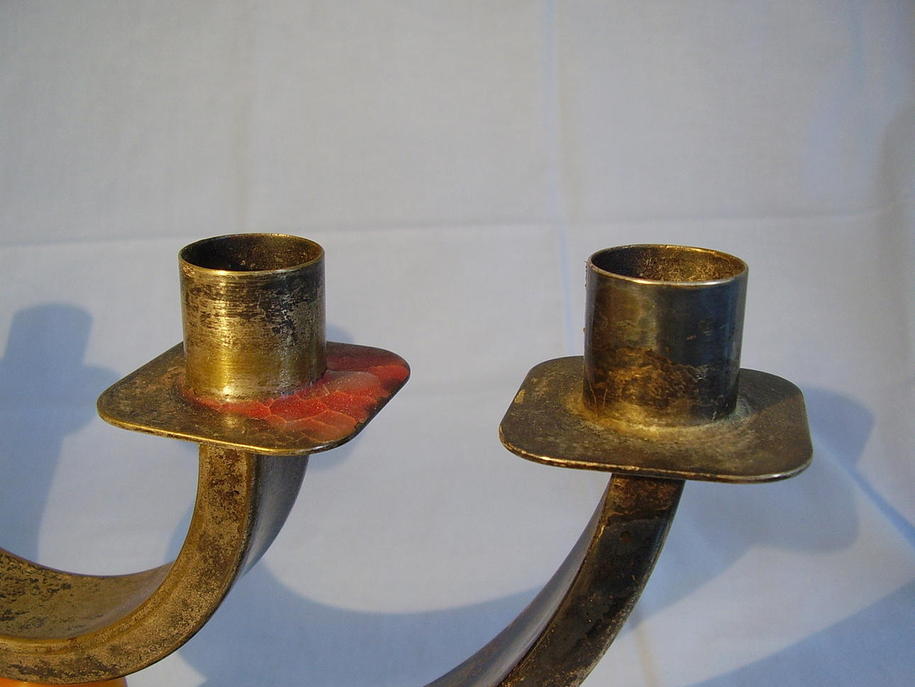 Tiene una base ovalada acanalada, de la que parten dos brazos de candelabro curvos, uno encima del otro, con un total de cuatro candelabros cuadrados y redondeados en el medio.