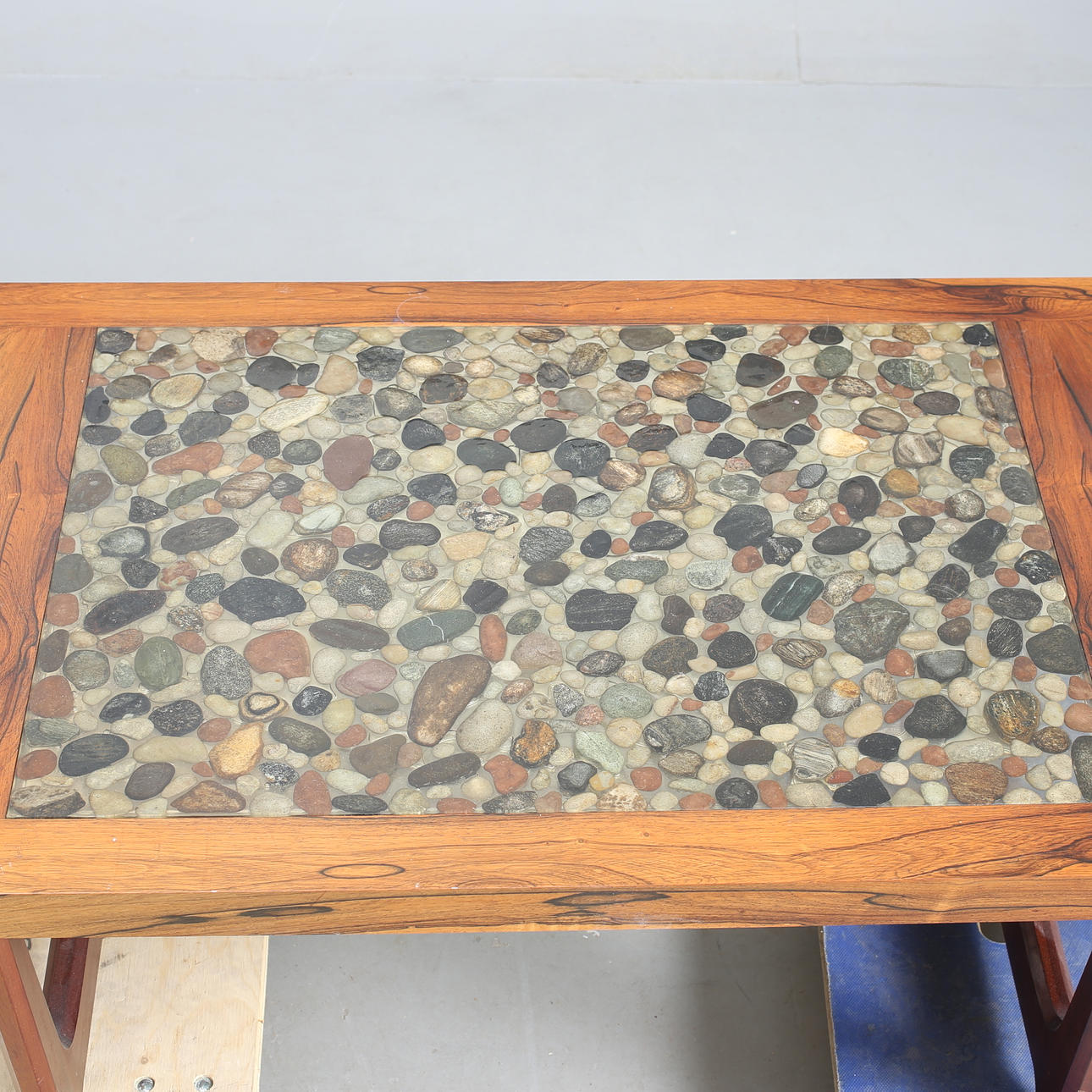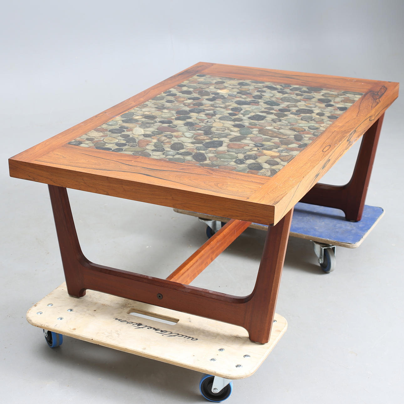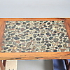 782637. MESA DE CENTRO, madera exótica. Disco con piedras incrustadas.