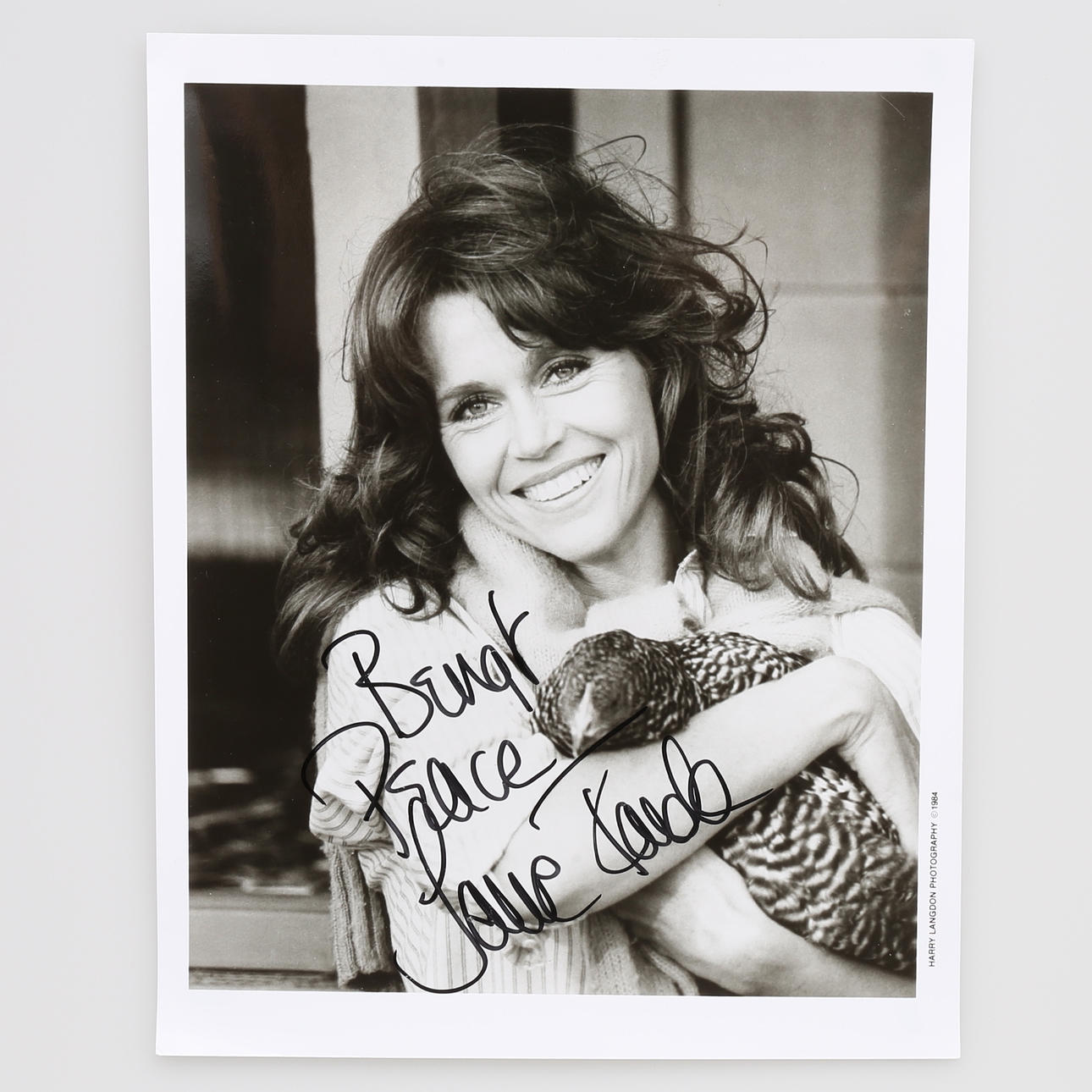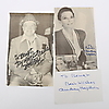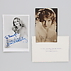Cinco autógrafos, varios de los cuales están dedicados al propietario nombrado por actores famosos. 1. Anita Ekberg, actriz sueca (1931-2015). Autógrafo con saludo en una fotografía en blanco y negro en formato postal donde Anita Ekberg se sienta en un perfil claro y sonríe a la cámara. "A Bengt. Anita Ekberg.2. Lillian Gish, actriz estadounidense (1896-1993). Dos autógrafos, uno en postal en blanco y negro con saludo personal y el otro en papel blanco en formato postal. 3. Bob Hope, actor estadounidense (1903-2003). Autógrafo sobre recorte de periódico de 21 cm. x 13cm con casi una toma completa de Bob Hope con un sombrero. En el medio, ha escrito "Para Bengt Mis mejores deseos Bob Hope" con un rotulador negro. 4. Audrey Hepburn, actriz británica (1929-1993). Dos autógrafos, uno de los cuales está en un recorte de periódico con una foto de una actriz de edad avanzada. Ha escrito "Para Bengt Audrey Hepburn" con un marcador azul en la imagen. Además, una tarjeta blanca - 9 cm. x 13,5 cm. - donde escribió "Para Bengt, mis mejores deseos, Audrey Hepburn" con un rotulador azul. 5. Una fotografía en blanco y negro de Jane Fonda, actriz estadounidense, nacida en 1937. La foto mide aprox. 24cm x 20cm -y muestra a una sonriente Jane Fonda con un pájaro en brazos. T. v. contra un fondo claro, ha escrito "To Bengt. Paz. Jane Fonda" con rotulador negro. 6. Melina Mercouri, actriz, escritora griega, etc. (1920-1994) . Una fotografía en blanco y negro - aprox. 18 cm. x 24cm - que es un primer plano de una Melina Mercouri sonriente y vital. Ella ha escrito su autógrafo con un bolígrafo en la parte inferior derecha de la imagen.