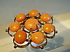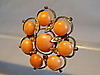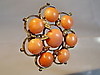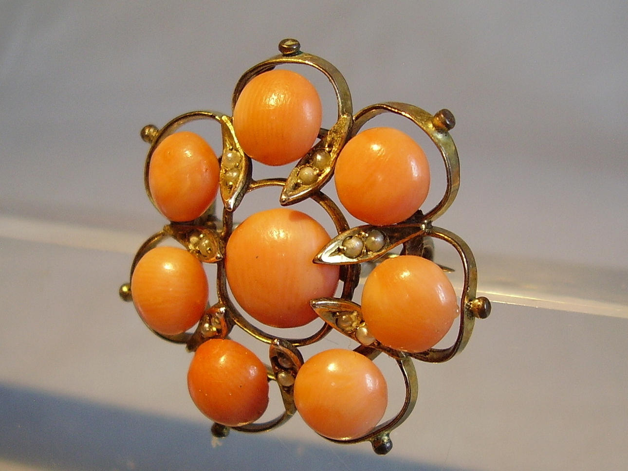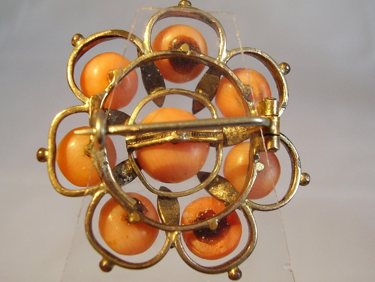 El broche antiguo está hecho de oro doble. Tiene forma redonda y está engastado con 7 botones redondos de coral natural rojo salmón que se entrelazan alrededor de un botón de coral más grande. Todos los corales son corales antiguos de Cerdeña finamente pulidos del mar Mediterráneo. Entre los botones de coral, las hojas lanceoladas están engastadas con finas perlas de río. Juntos, los corales tienen aprox. 10 centavos