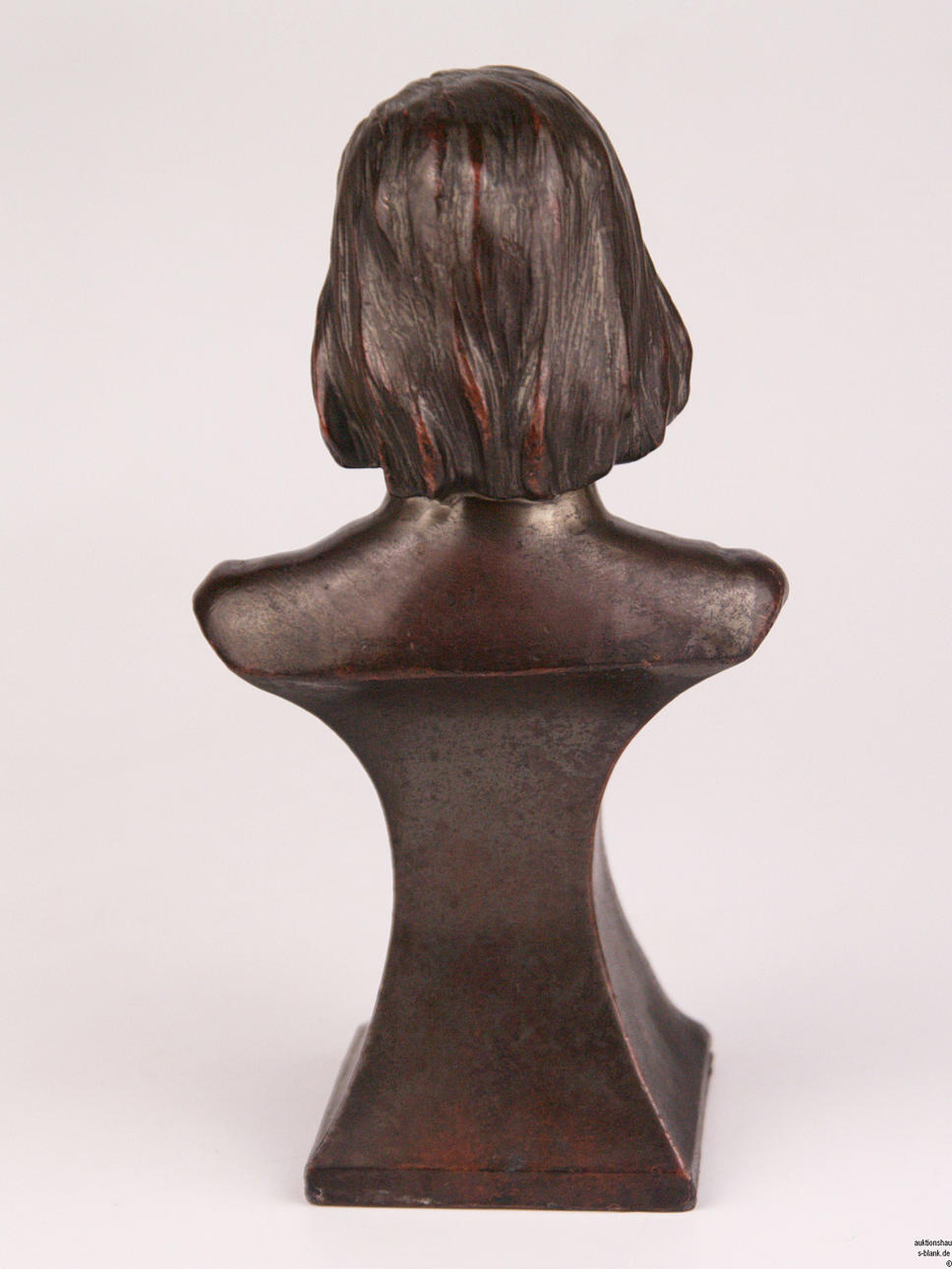 Pequeño busto del compositor Franz Liszt - bronce, con la inscripción "Liszt" sobre una base cónica cuadrada, altura total aproximada de 16 cm, alrededor de 1900.