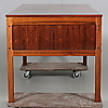 Chapa con jacaranda. Hurto con tres cajones y placa de desahogo extraíble y puerta abatible con almacenaje detrás. Parte trasera con estante. Longitud 150. Ancho 78. Altura 74 cm.
