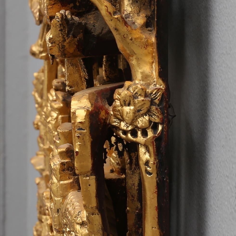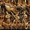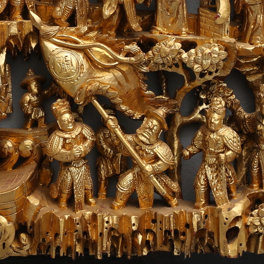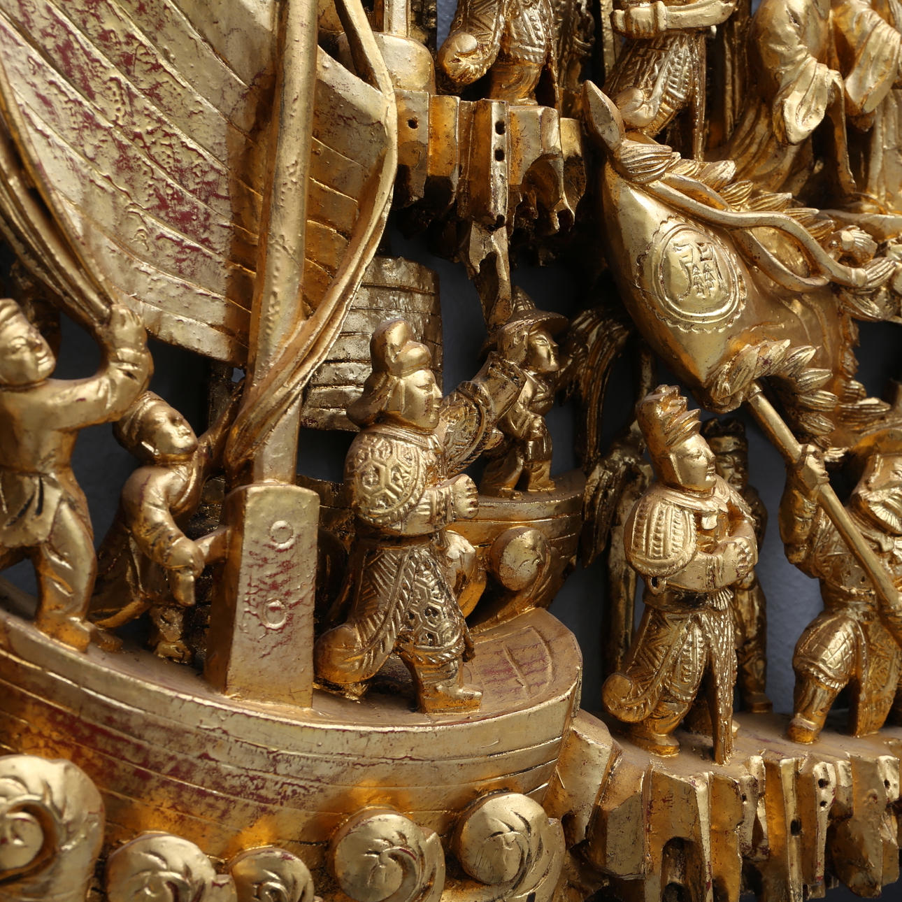Decoración ricamente tallada con gente a caballo y en botes.