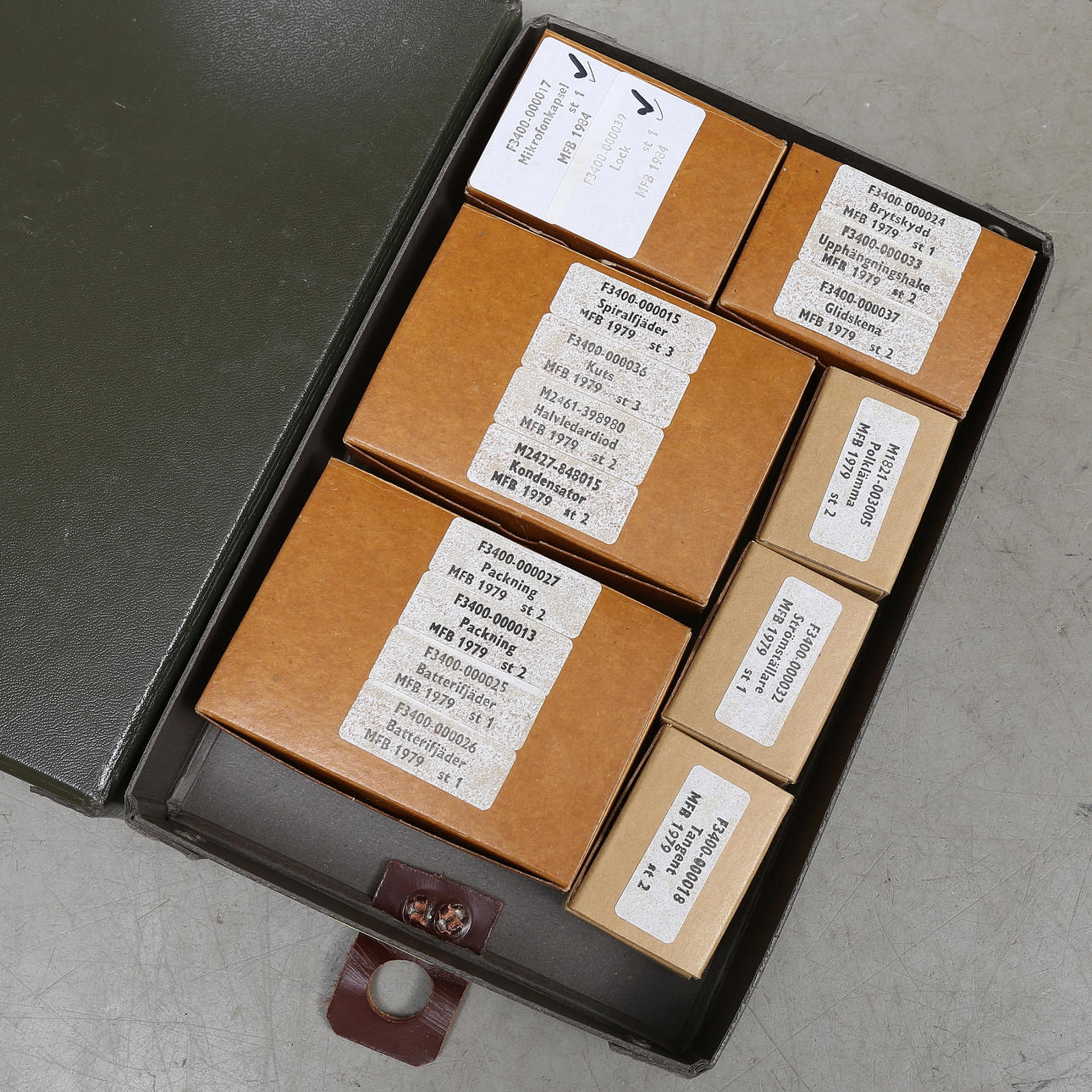 Con varios accesorios. Altura 38 cm. Viene con una caja de madera que contiene varios accesorios como resortes, auricular y más.
