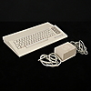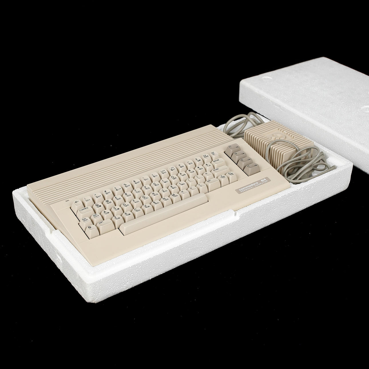 Commodore C64C (o C64-II) en caja original. Teclado extra del C128, disquetera externa y unos 20 discos, dos joysticks y cableado.