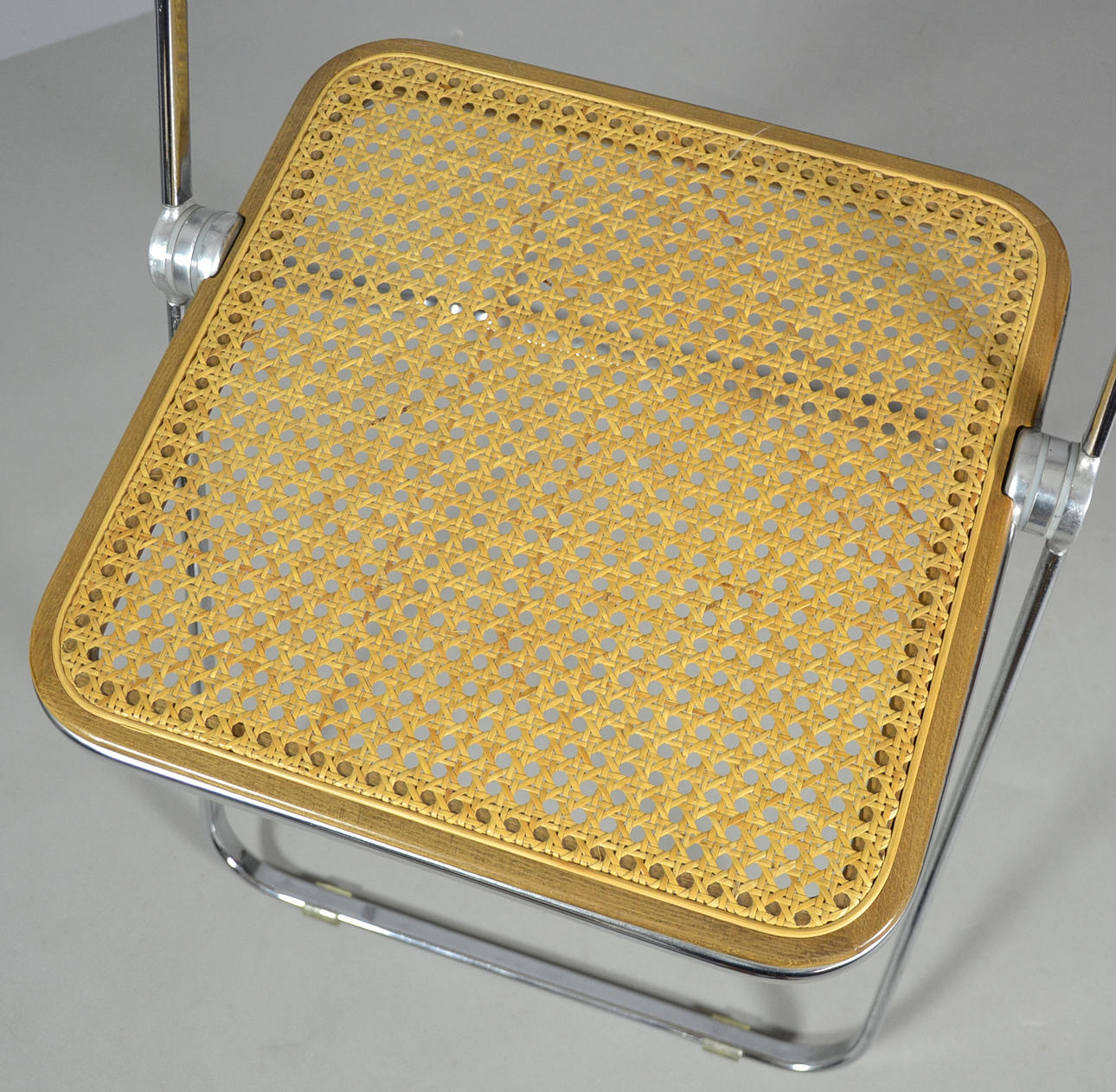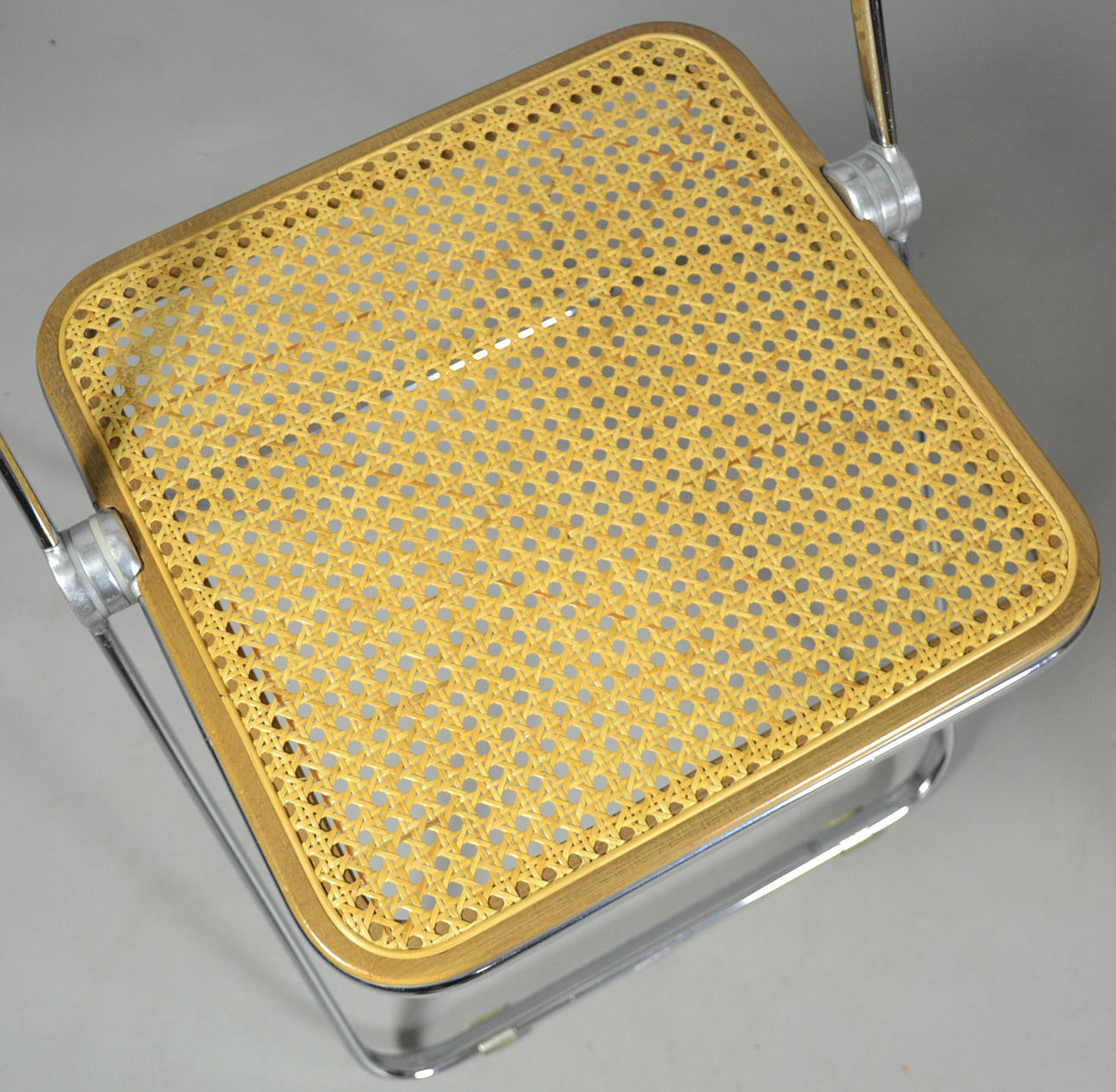 Diseño Giancarlo Piretti de 1967 versión Castelli Estructura de metal cromado con inserciones de marco de madera de haya con malla.