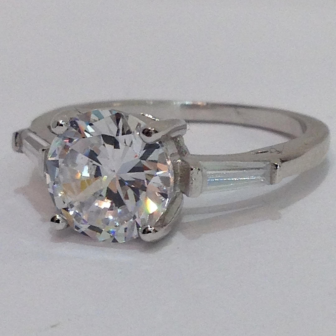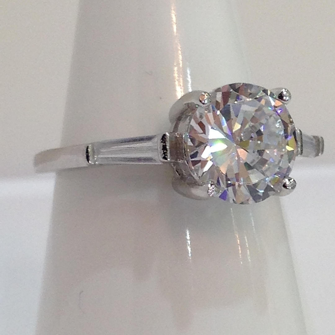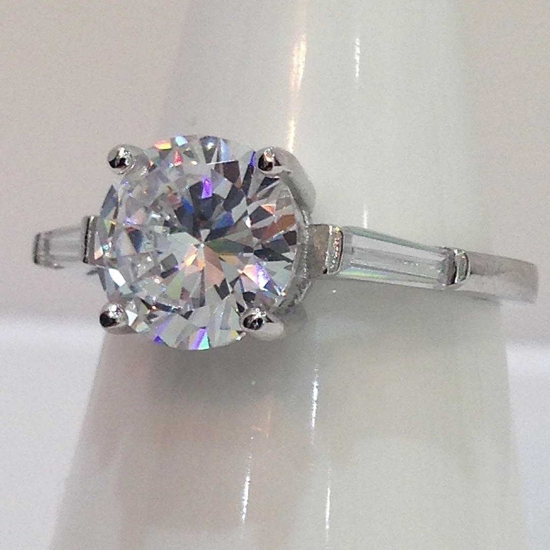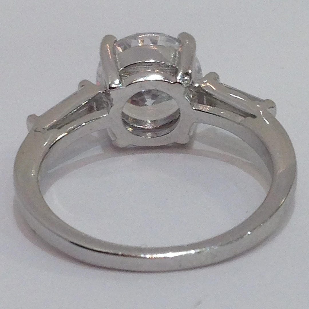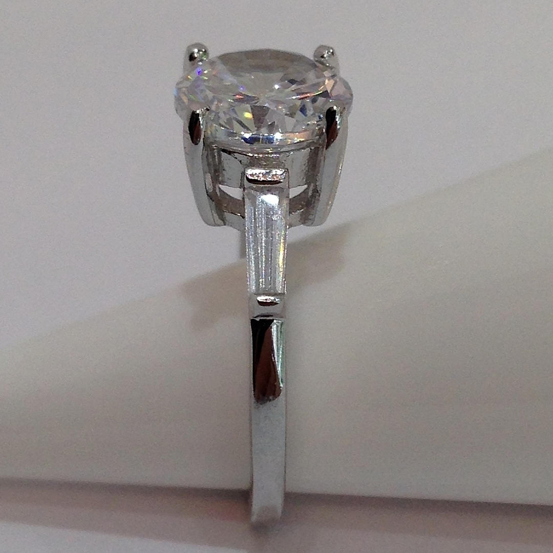 Cada hombro del anillo está engastado con una piedra de zirconia cúbica blanca de talla baguette cónica.