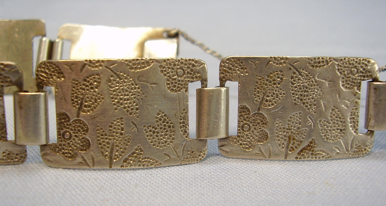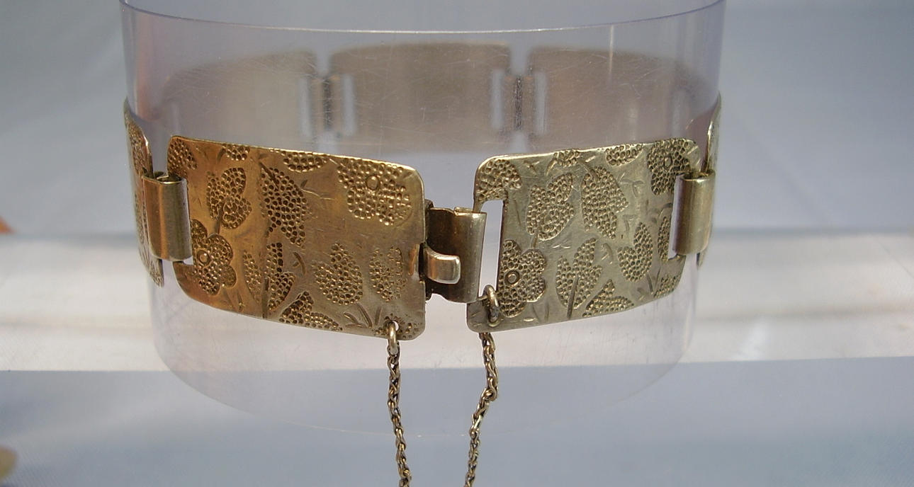 Consta de siete eslabones rectangulares ligeramente curvados que se conectan entre sí de forma flexible con ojales anchos. Cada eslabón está decorado con motivos estilizados de flores y hojas en relieve.