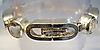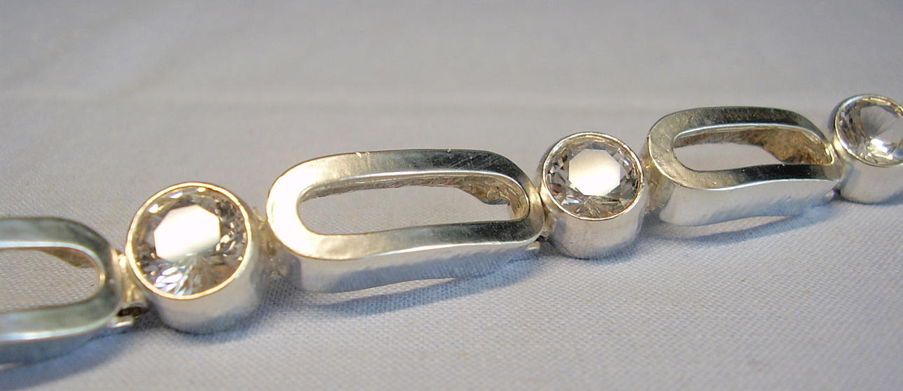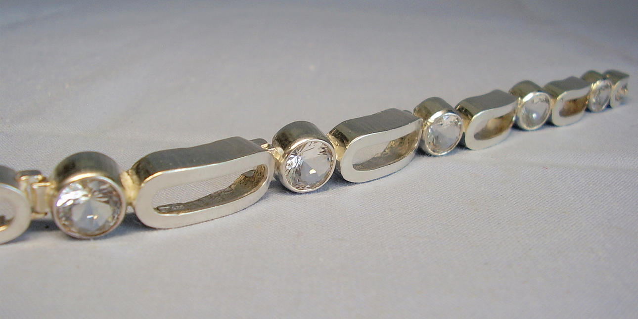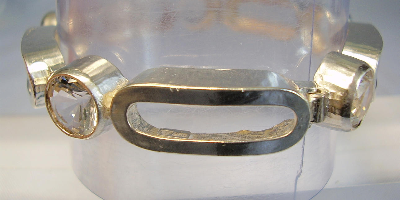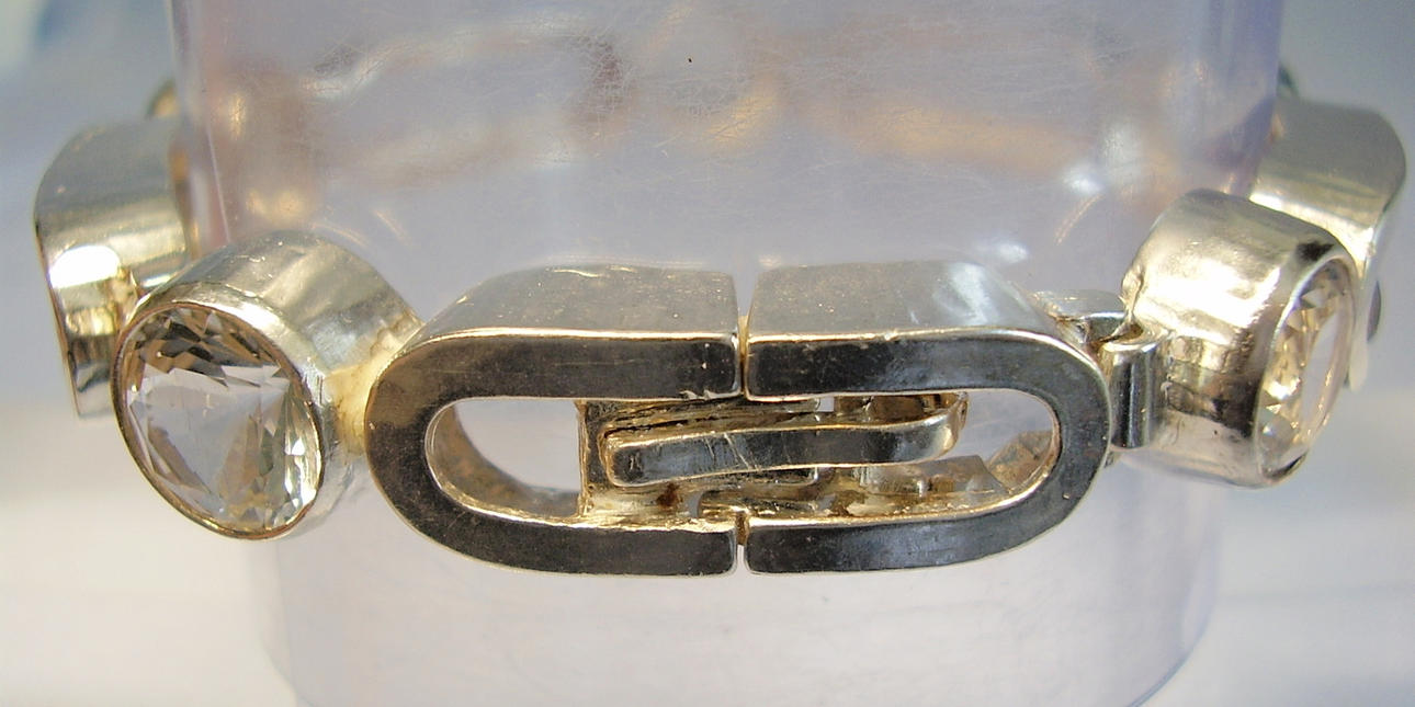 Está hecho de 5 eslabones ovalados forjados a mano, cada uno de los cuales lleva un cristal de roca redondo. Estos enlaces están conectados de forma móvil entre sí. El brazalete se cierra con un cierre de gancho integrado oculto con un mecanismo de cierre inusual.