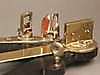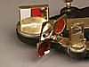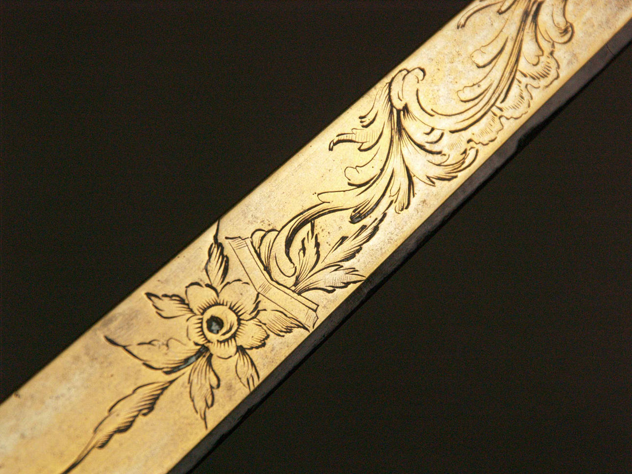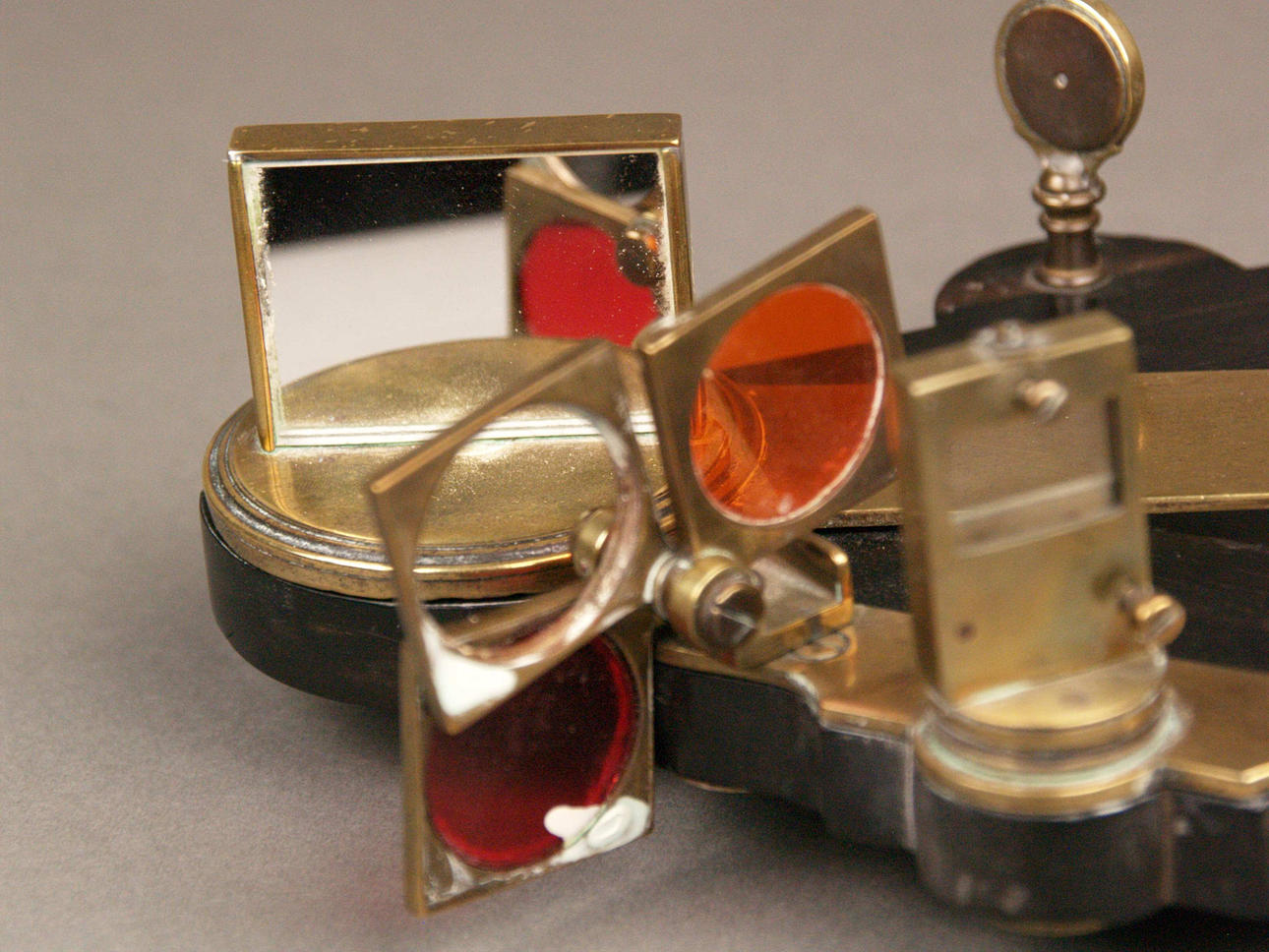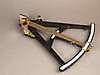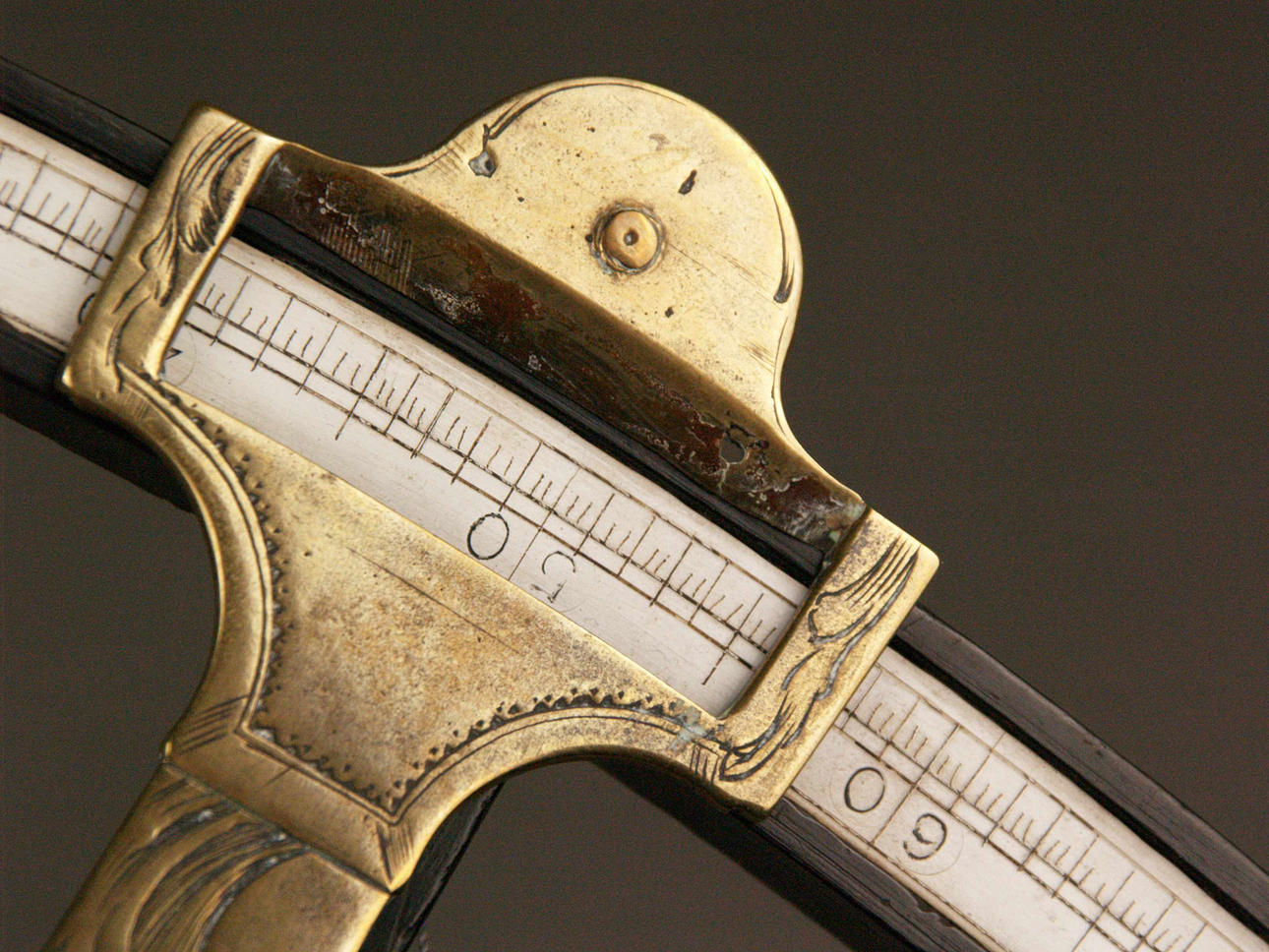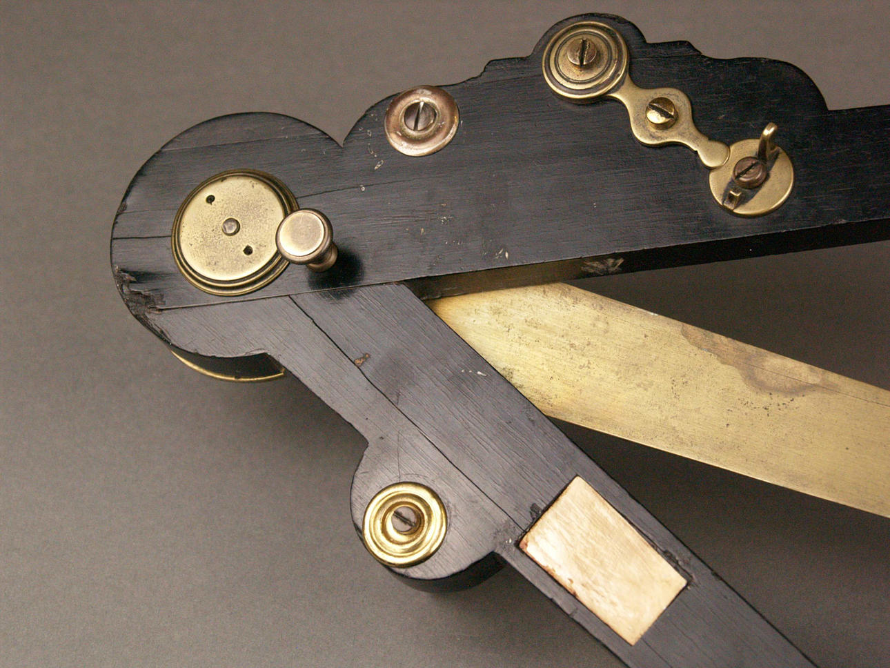 Octante - Segunda mitad del siglo XVIII, madera ebonizada, latón e incrustaciones de hueso, grabado con motivos florales, escala de medición 0-100, falta el filtro central, L.ca.46cm.