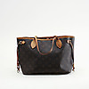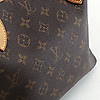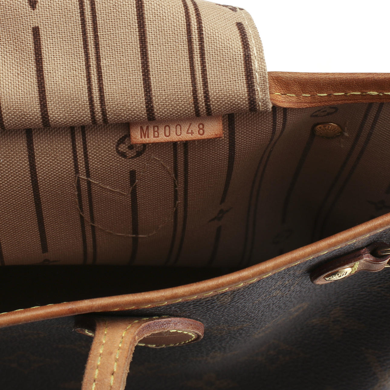 Loneta estampada Monogram con detalles en piel marrón claro y metal amarillo. 22 x 30 x 14 cm. Un compartimento con cremallera. MB0048.