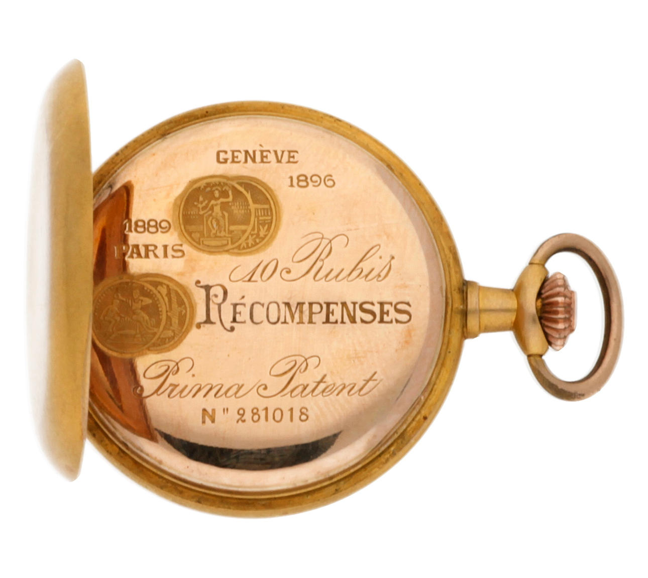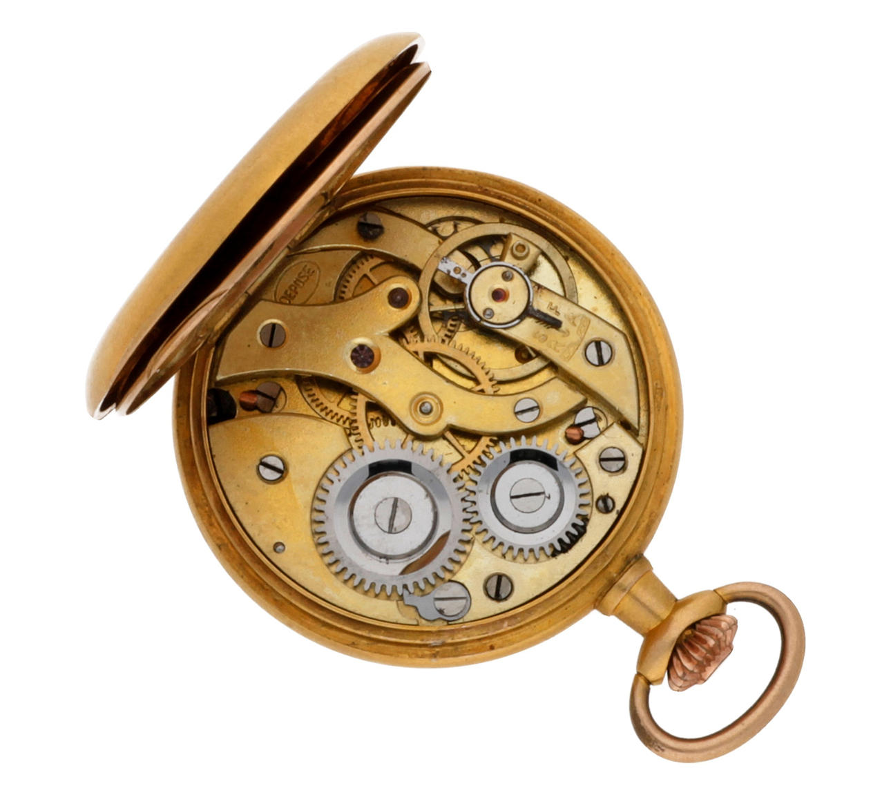 Caja de oro amarillo 18k con 30mm de diámetro. 3 tapas con esfera porcelana. Máquina de latón. Grabado interior 1889 Paris 10 rubis Récompenses prima Patent. Peso total 21,1gr.