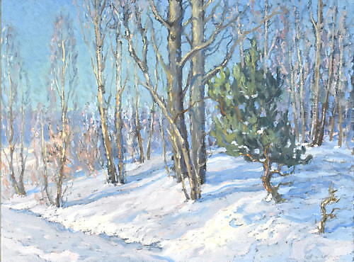 Krüger's paintings are characterized by their expressive and often dreamlike quality, particularly his depictions of landscapes and winter scenes. He worked primarily with oil on canvas and oil on board, capturing the serene beauty of the Swedish countryside with thick, textured layers of paint. His subjects were diverse, including portraits, nudes, and figure paintings, but he is most recognized for his landscapes and winter motifs, which often feature snow-covered huts and trees. His style can be described as post-impressionistic, with a strong focus on capturing the atmosphere and light of a scene rather than a strict, realistic representation.