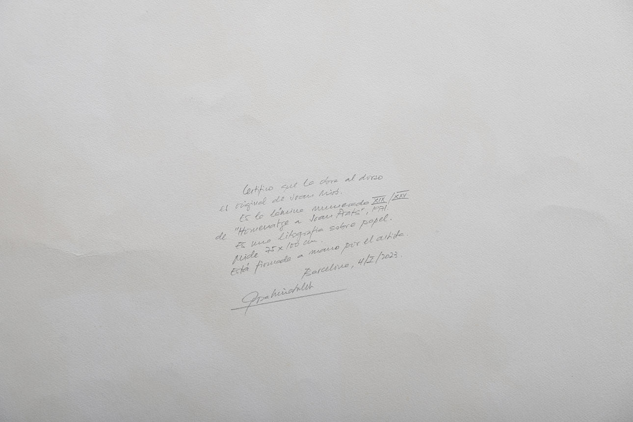 Firmada y numerada XIX/XXV. Realizada en 1971 fue originalmente incluida en la suite "Homenatge a Joan Prats". En el reverso, certificada a lápiz por Rosa Maria Malet en Barcelona el 4 de enero de 2023.