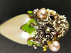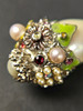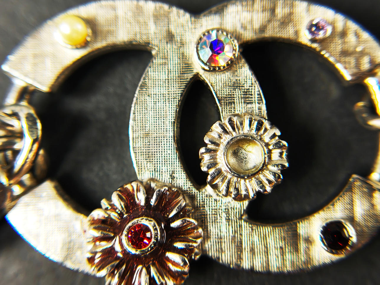 con el doble cierre con el logotipo de CC Chanel con pequeñas piedras sintéticas y flores estilizadas, cadena plateada y colgante con gota de perlas de resina adornada con cristales y flores, longitud total de 105 cm, con caja.