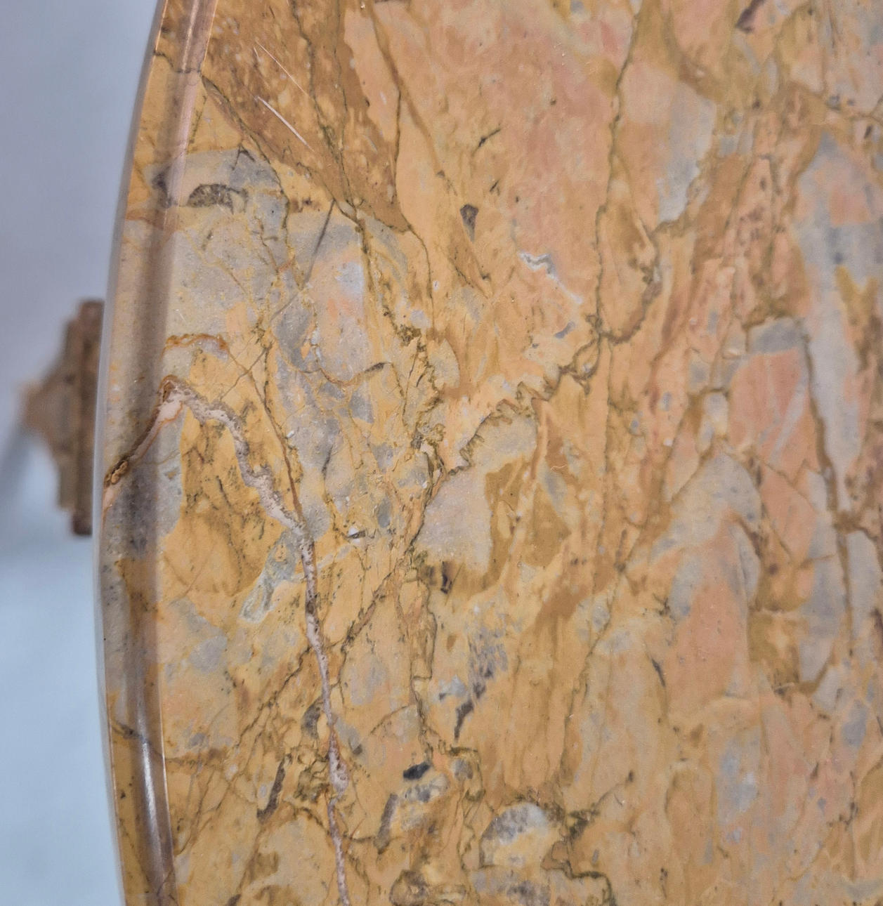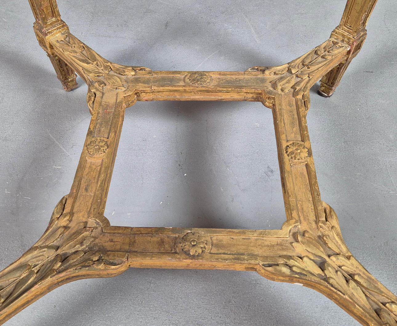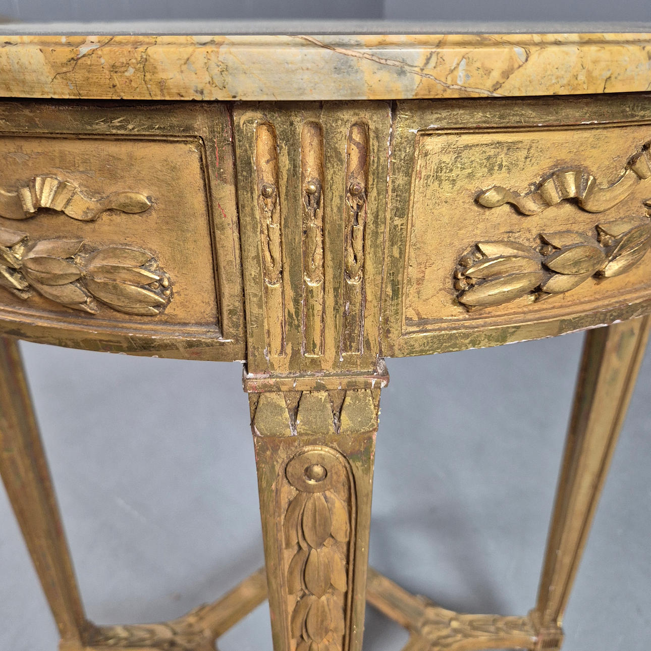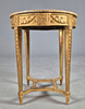 finales del siglo XIX y principios del XX, de forma circular, acabado en mármol, marco de madera dorada, con decoración de yeso aplicado al friso, levantado sobre patas cuadradas con decoración moldeada aplicada, 79 cm de alto x 64 cm de diámetro.