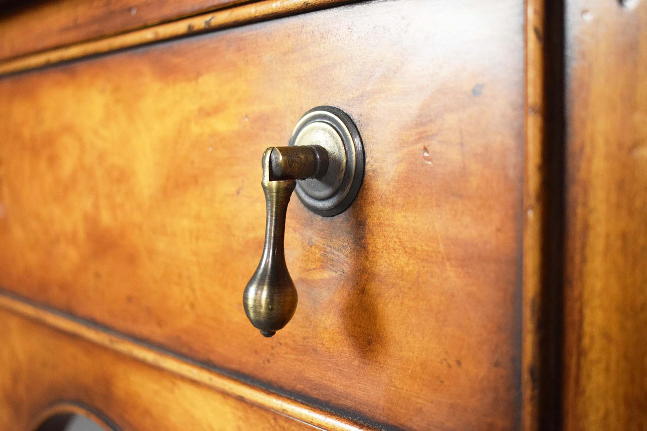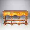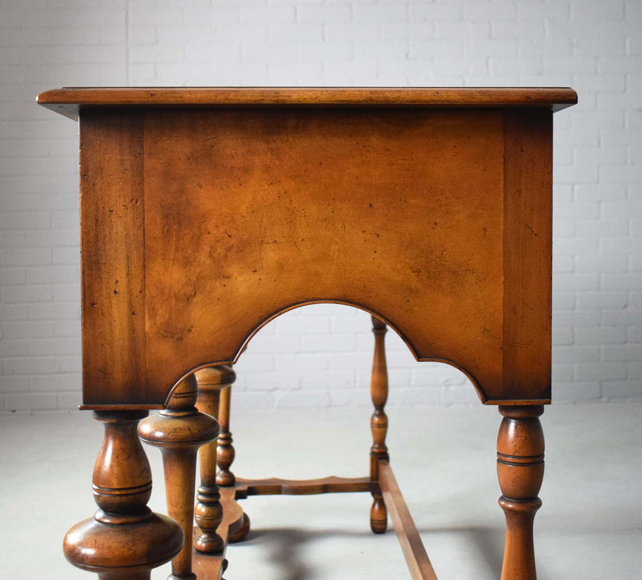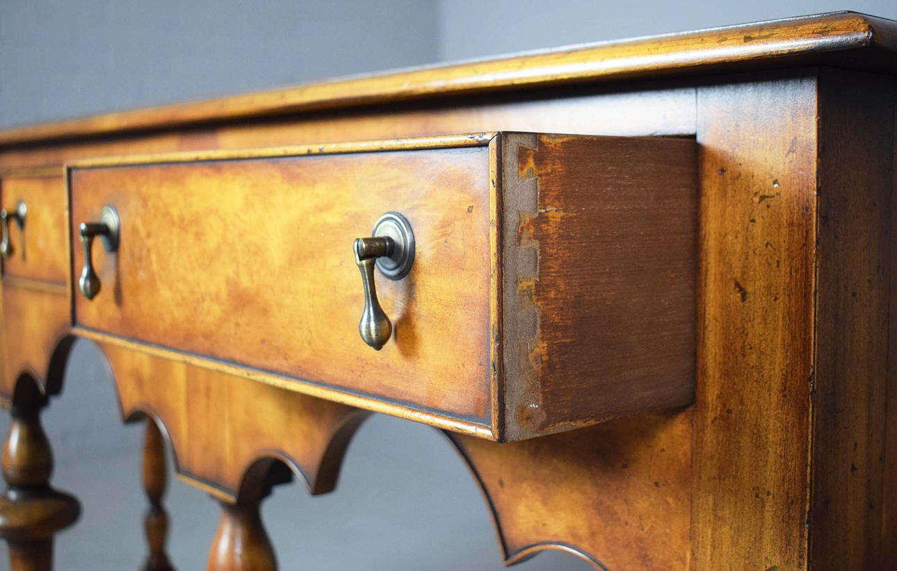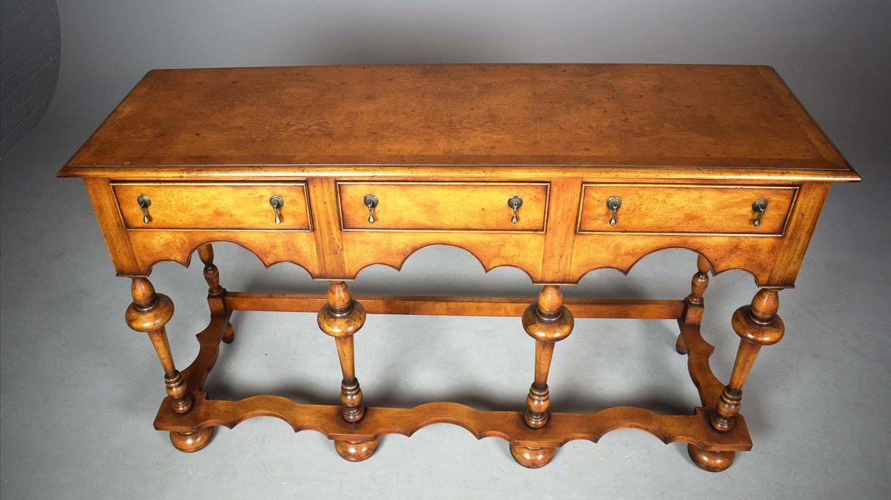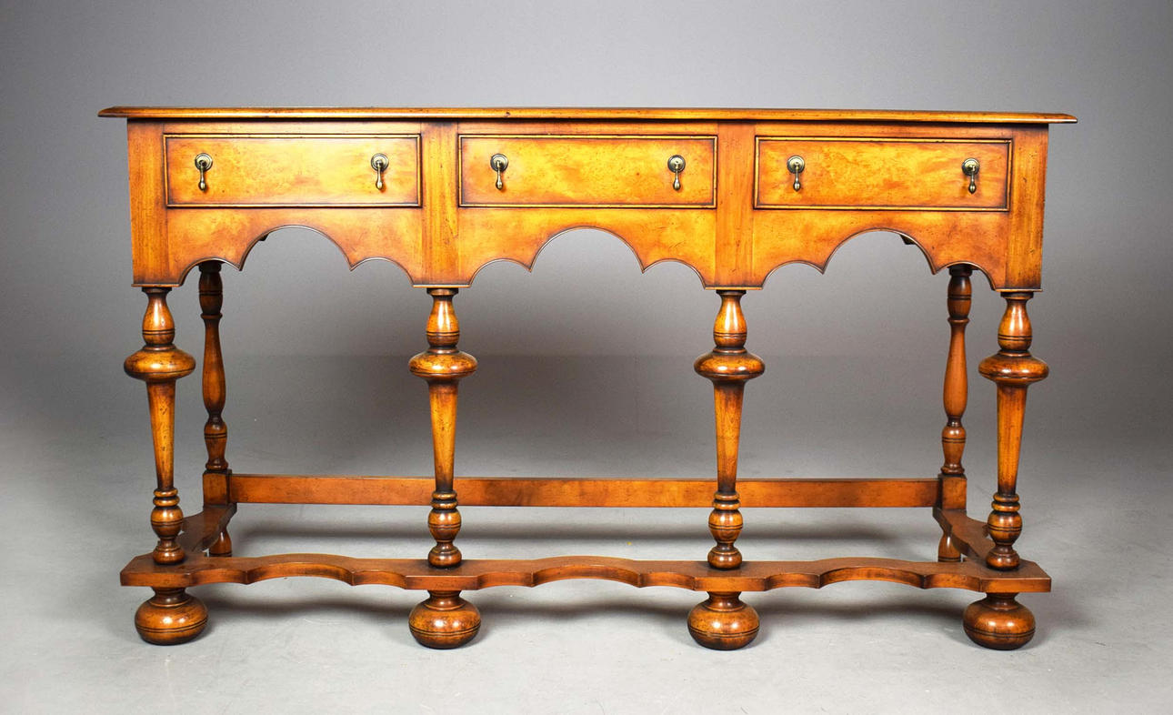 reproducción de nogal, con soportes torneados y tres cajones, 50 cm de profundidad x 161 cm de ancho x 97 cm de profundidad.