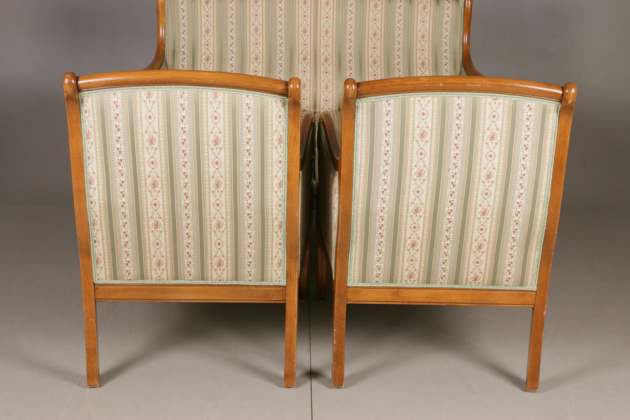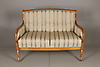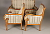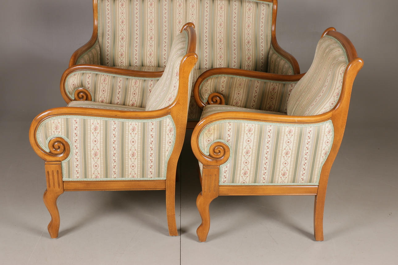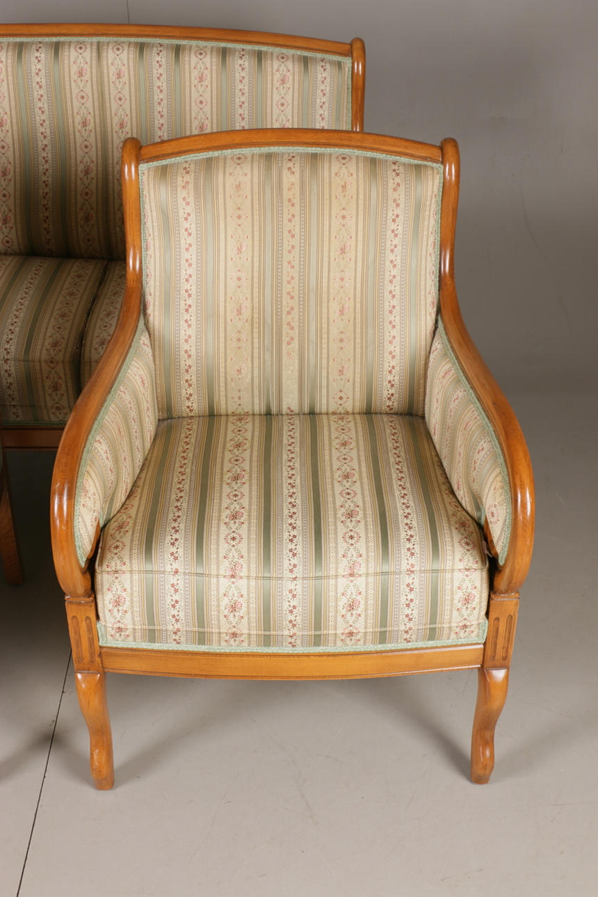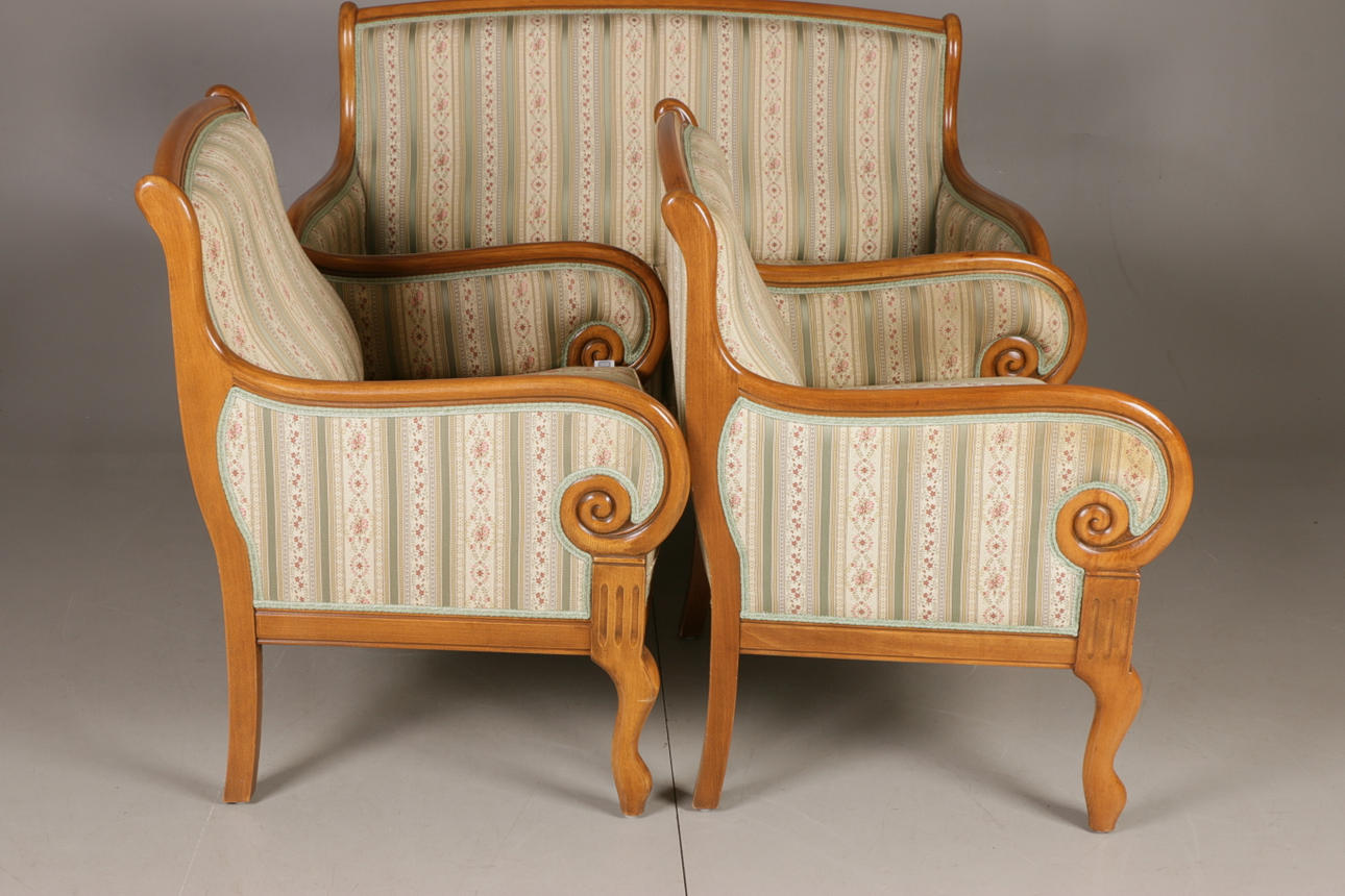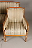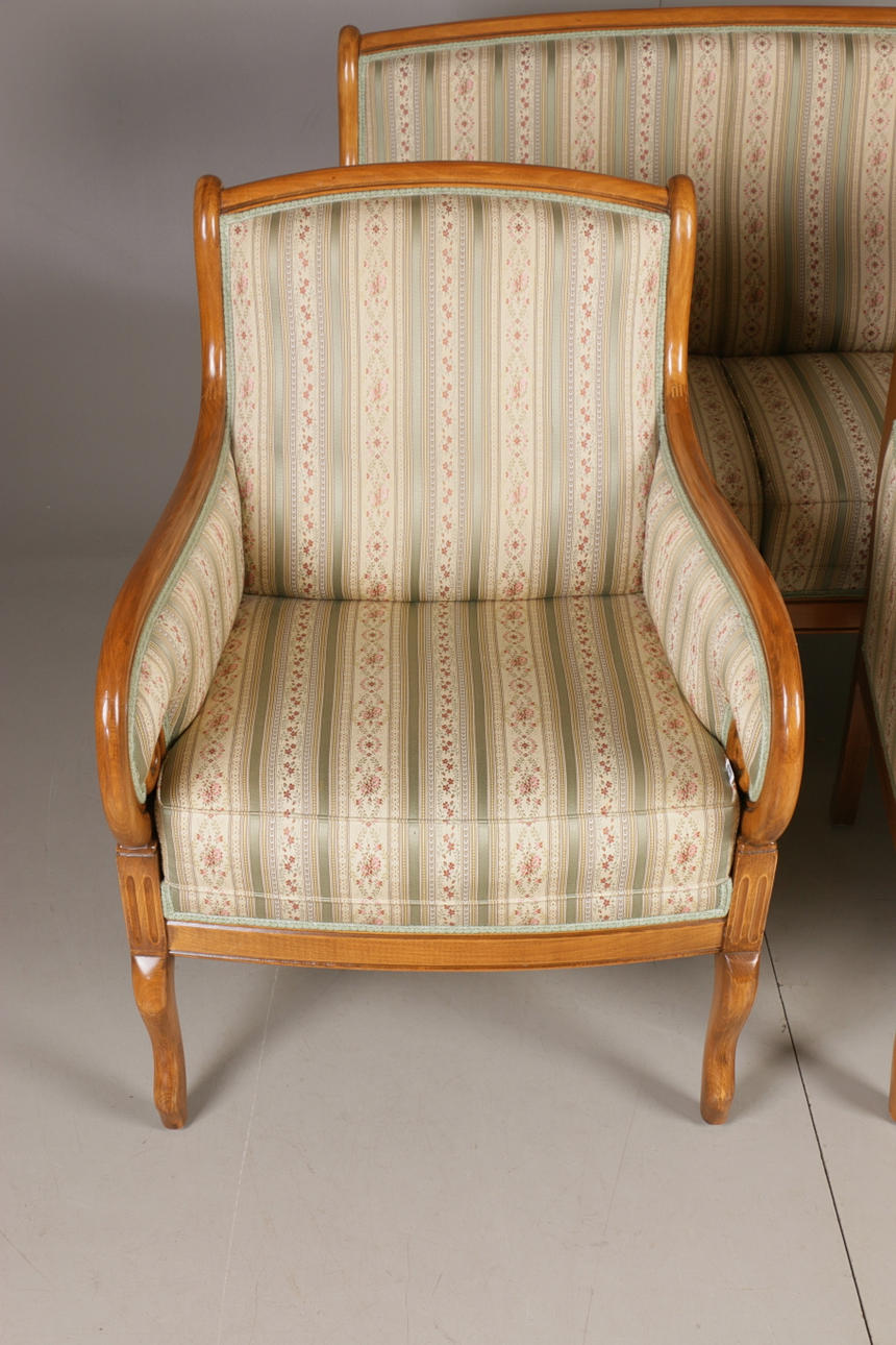 Empire-tyylinen olohuonekalusteet, jossa sohva ja kaksi nojatuolia Sohva kiinteällä verhoilulla pehmustetun istuimen ja selkänojan päällä Pituus 131, istuinkorkeus 47, istuinsyvyys 46,5, selkänojan korkeus 94 cm Kaksi nojatuolia, selkänojan korkeus 92, istuinkorkeus 47, istuinsyvyys 45 , leveys 68 cm.