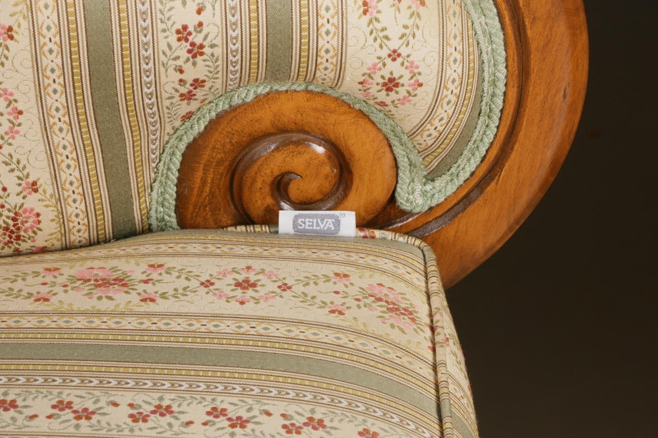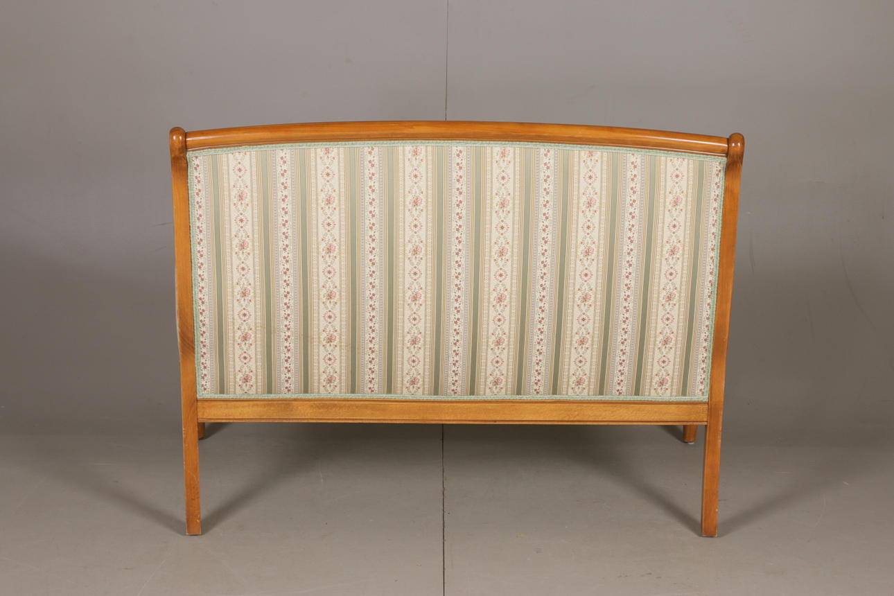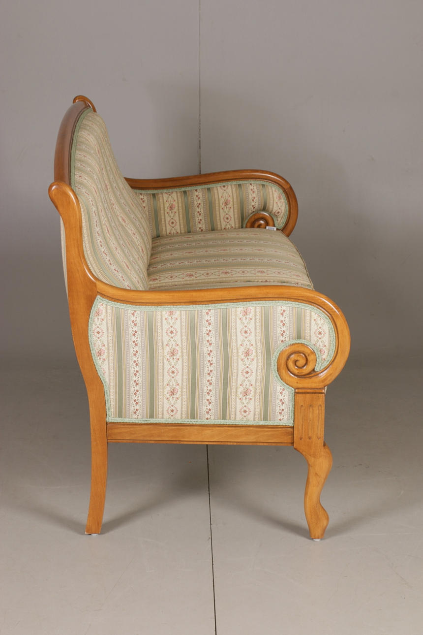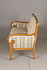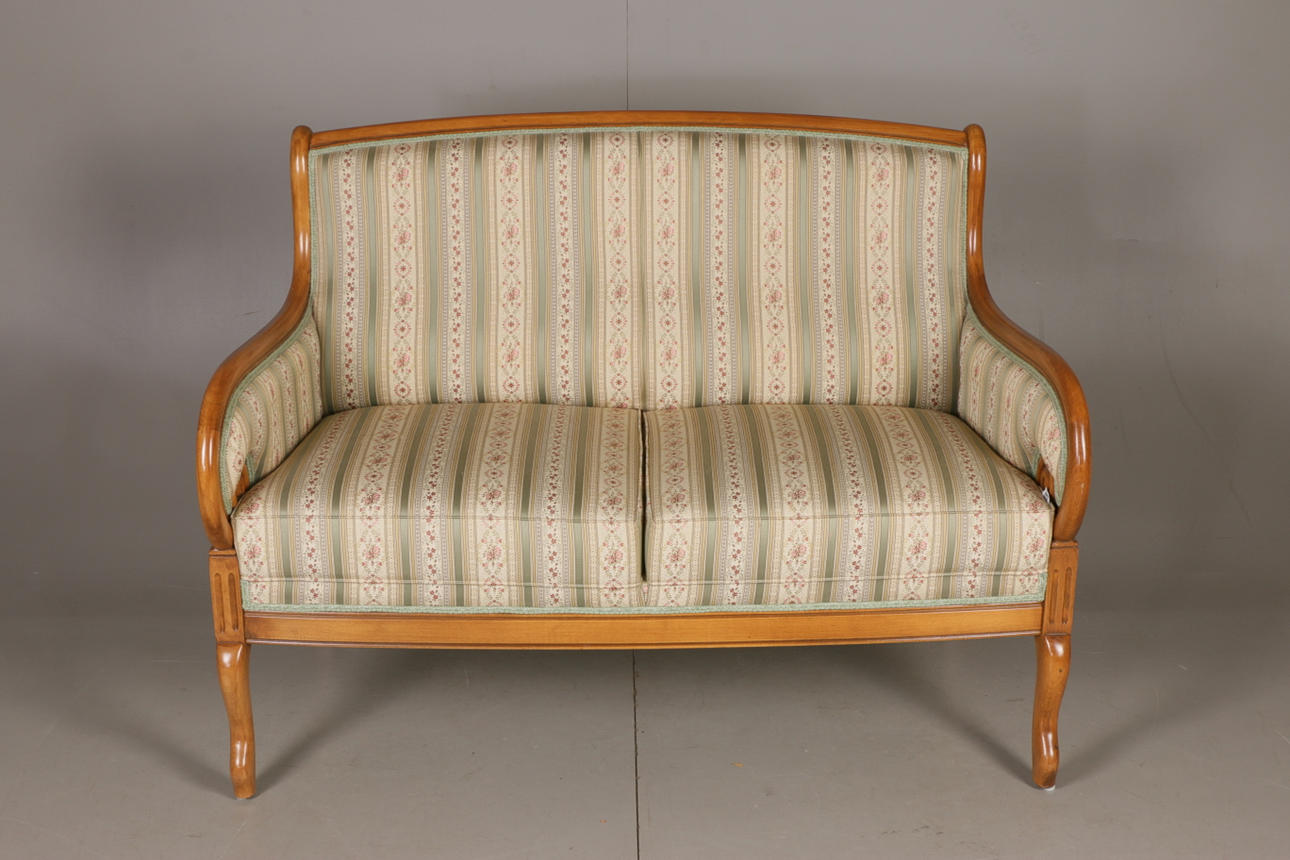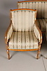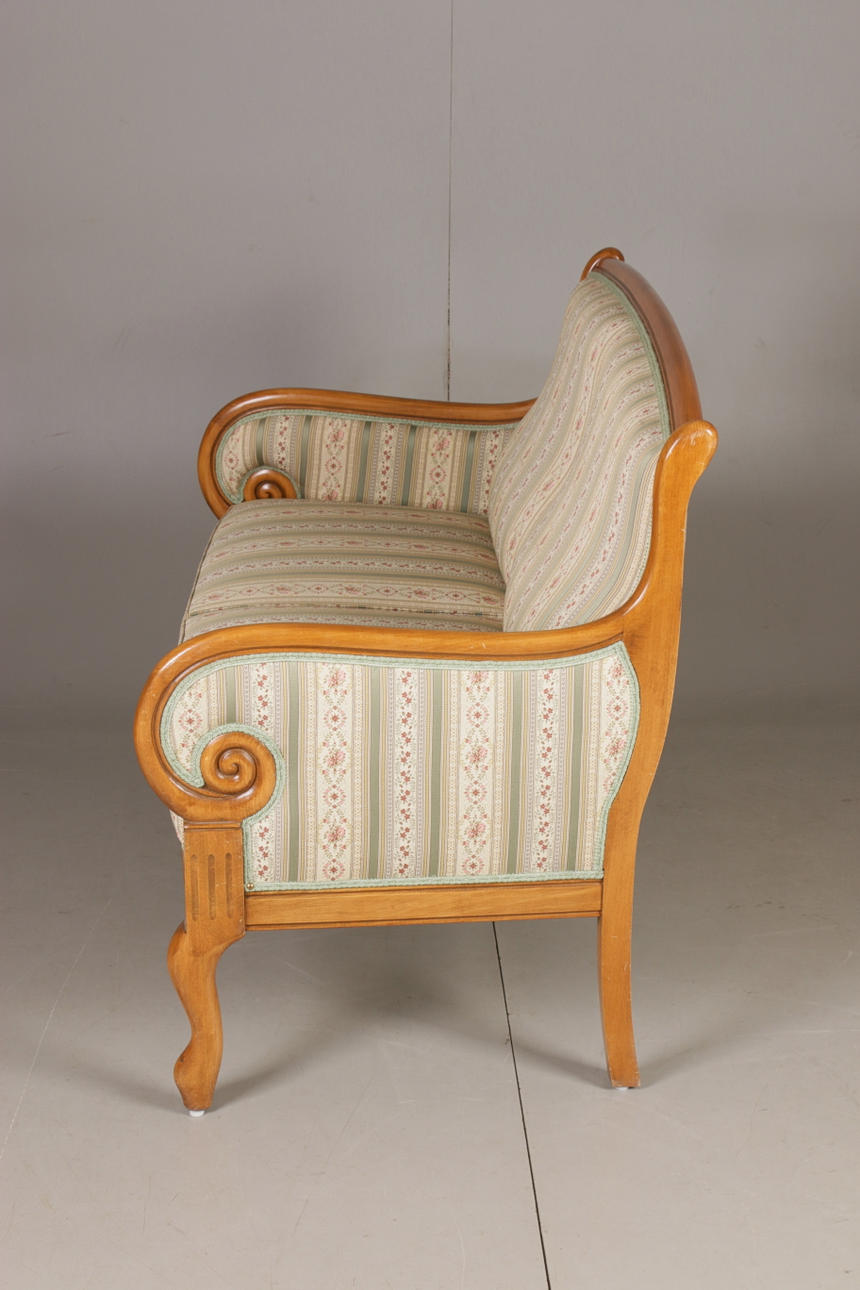 Empire-tyylinen olohuonekalusteet, jossa sohva ja kaksi nojatuolia Sohva kiinteällä verhoilulla pehmustetun istuimen ja selkänojan päällä Pituus 131, istuinkorkeus 47, istuinsyvyys 46,5, selkänojan korkeus 94 cm Kaksi nojatuolia, selkänojan korkeus 92, istuinkorkeus 47, istuinsyvyys 45 , leveys 68 cm.