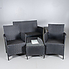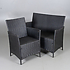 Sohva, 1 pari nojatuolia, pöytä ja tyynylaatikko, sohvan pituus 105 cm.