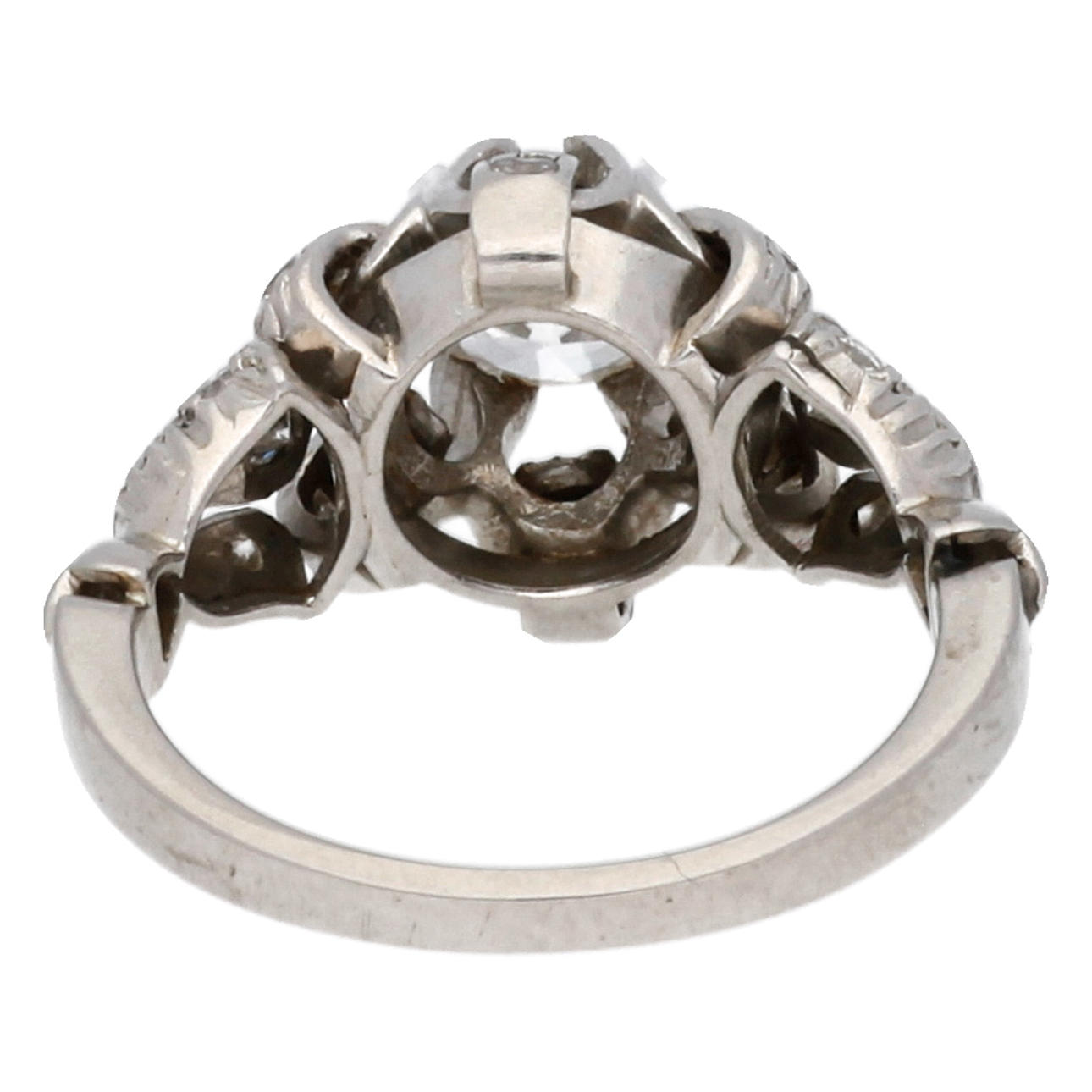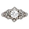 Platina, briljanttihiottu keskitimantti, n. 0,98 ct, GH väri n., VS kirkkaus n. ja loput briljanttihiottuja timantteja, 0,32 ct. 6,8 g.