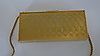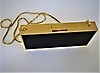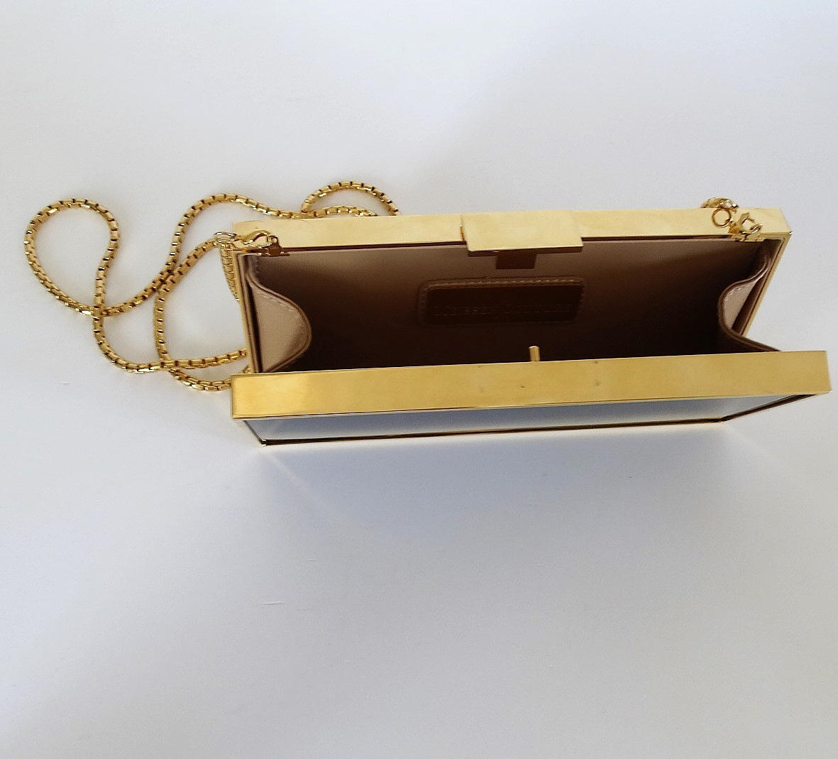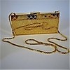Kytkin, kullanvärinen, metallia, kuviona miekkamerkki ja musta levy, sisäpuoli beigeä nahkaa, pitkä kullanvärinen metallilanka, Cosmopolitan Collection Meissenin posliinimanufaktuurista, 2015, n. 20x9x6cm.