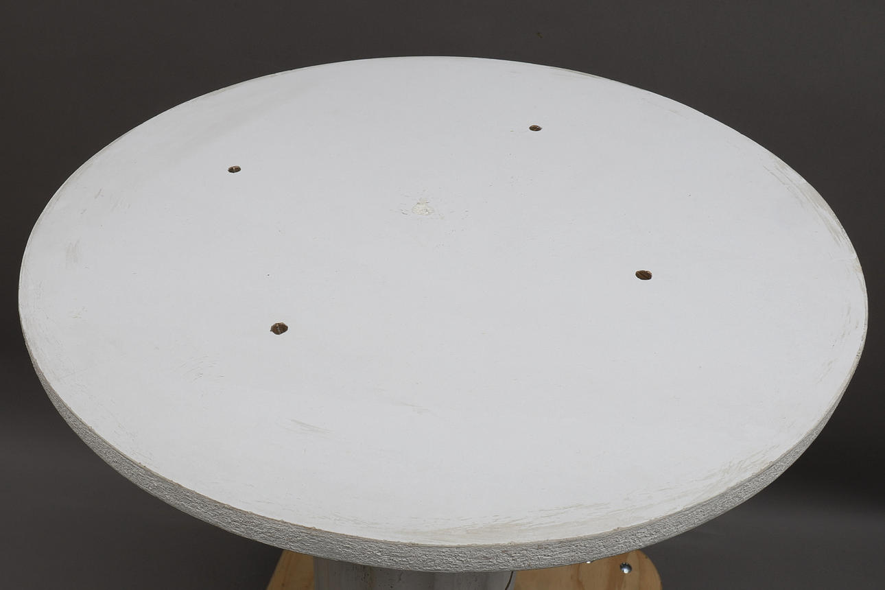 Korkeus n. 88,5 cm puisella kannella. Puulevyn halkaisija n. 50 cm, jalustan halkaisija yläpuolella n. 40 cm.