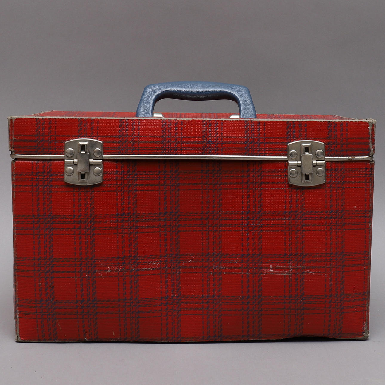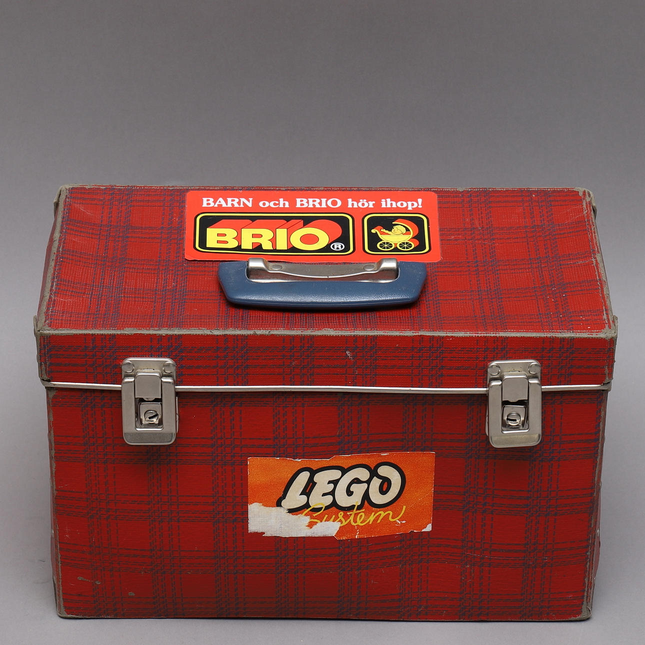 Punainen ja musta ruutukassi, nepparikiinnitys ja kahva, tarroja Legolla ja Briolla. Mitat noin 35,5x19,5x22 cm.