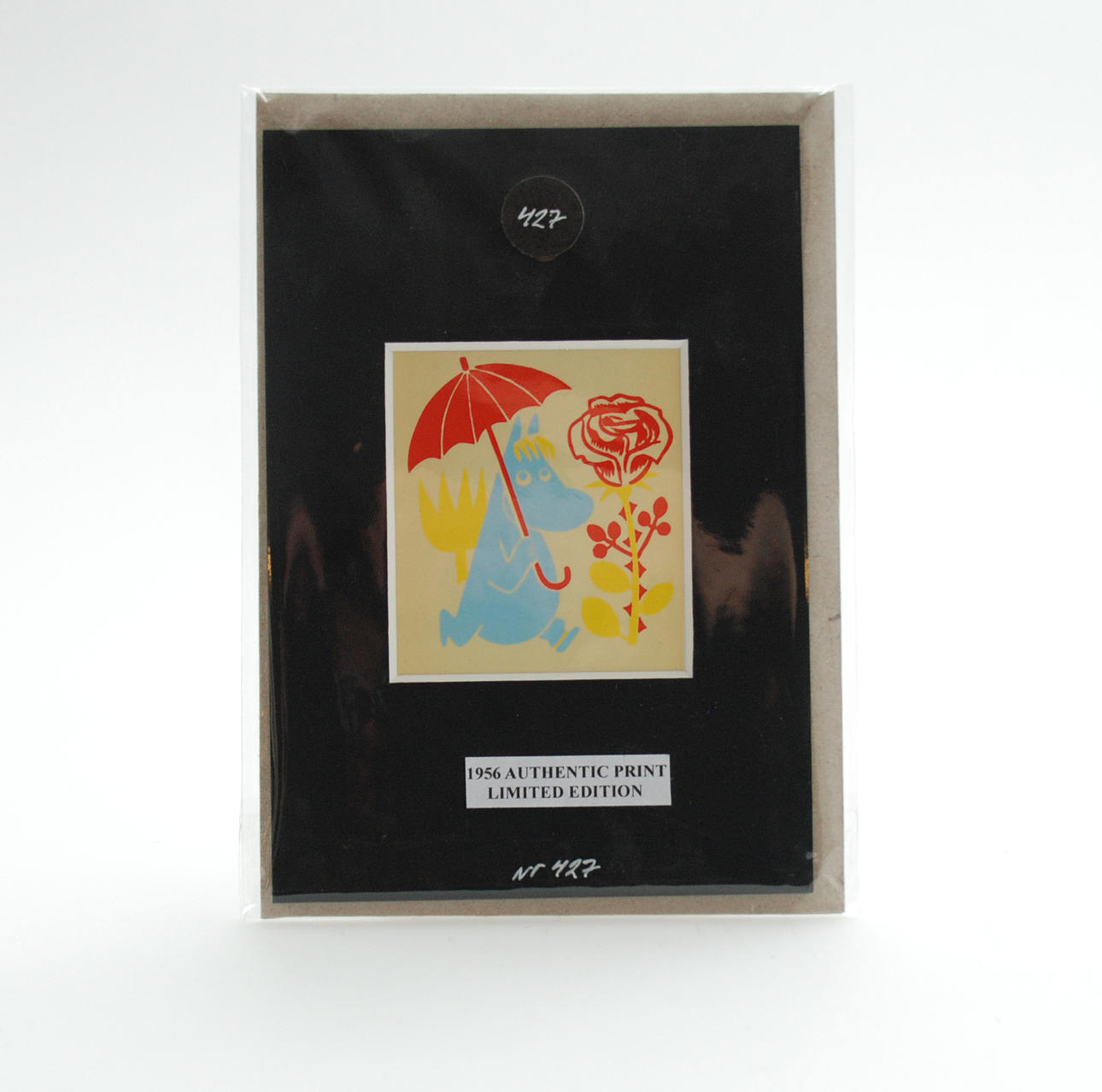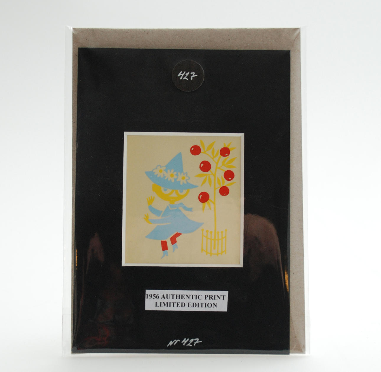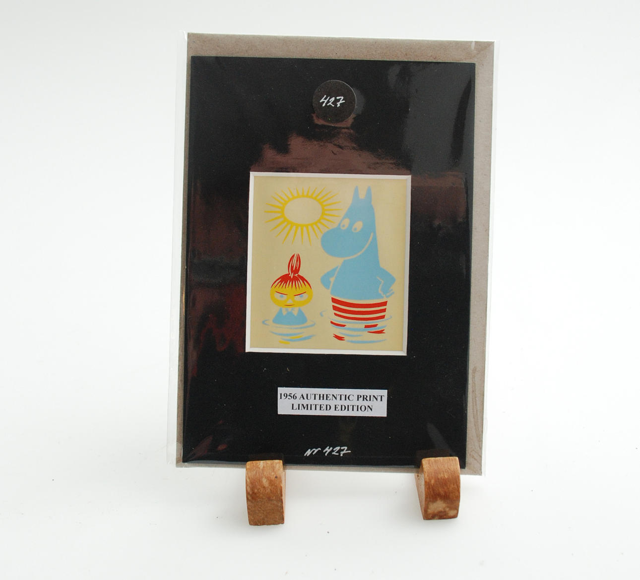koko passpartoutilla 15x10,5 Printit koostuvat neljästä eri hahmosta: Muumipeikko & Pikku My Snurkin Snorkmaid Sniff Ne ovat ensimmäiset kaupallisiin tarkoituksiin käytetyt muumiprintit, jotka on tehty yksinomaan Stockmannin luksustavaratalolle Helsingissä vuonna 1956.