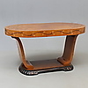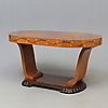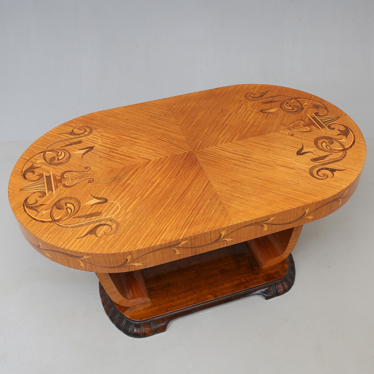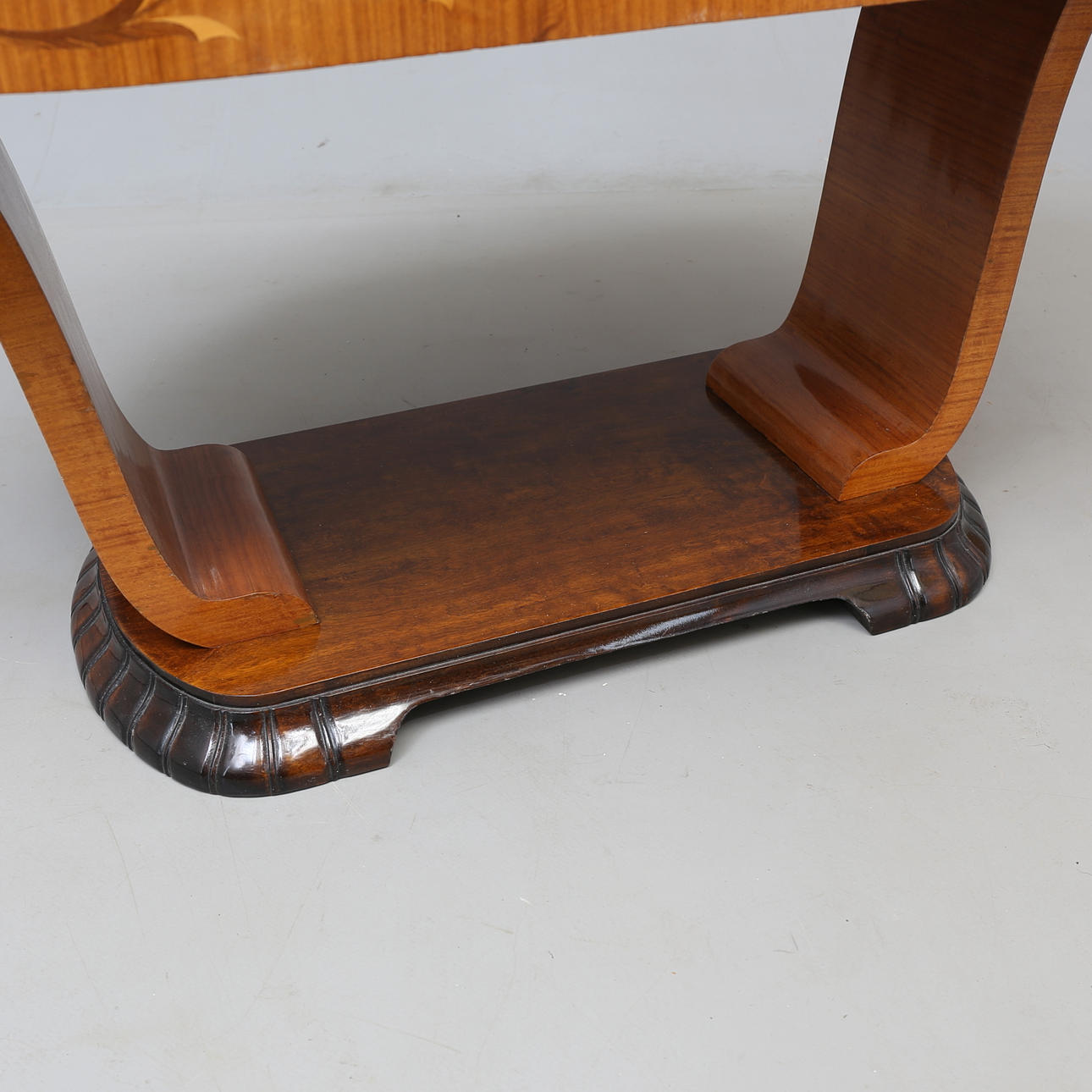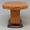 Kirkas lakattu pöytä intarsialeikkauksella pöydässä ja reunoissa. Pituus 109,5 cm, leveys 65,5 cm, korkeus 59 cm.