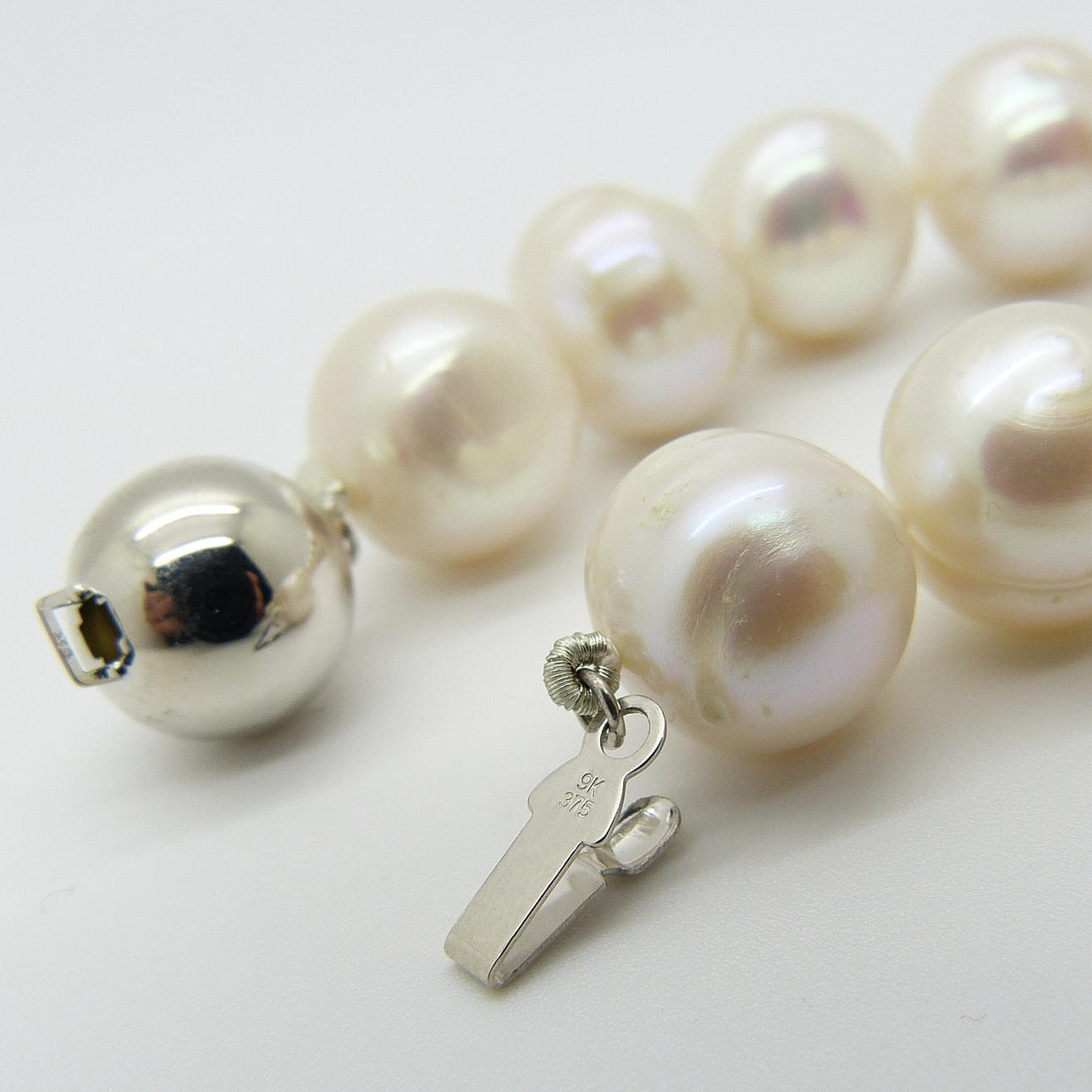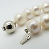 Kaulakoru, joka on pujotettu 32 x valkoisilla viljellyillä helmillä ja varustettu 9k valkokultaisella pallolukolla.