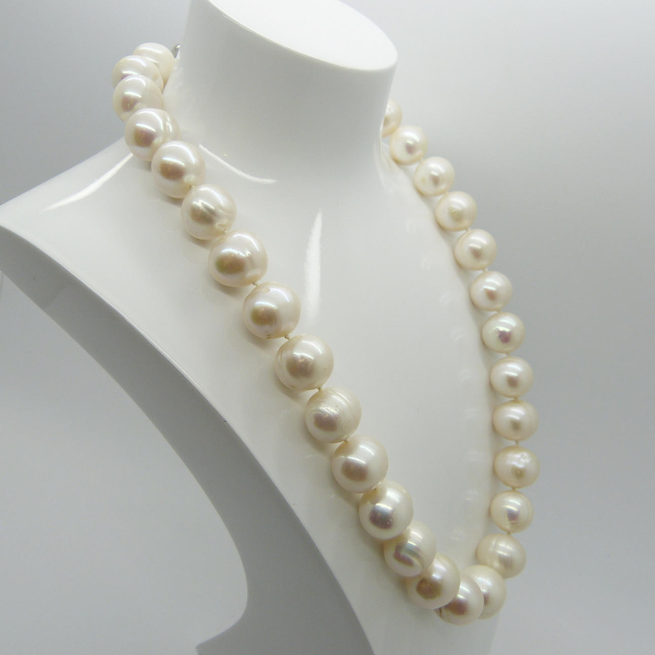 Tämän kaulakorun viljellyt helmet ovat halkaisijaltaan 11 mm - 14 mm, n.