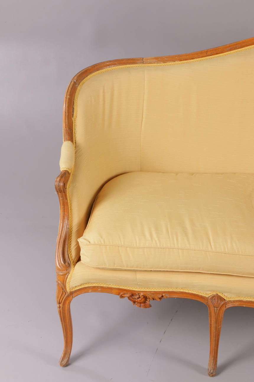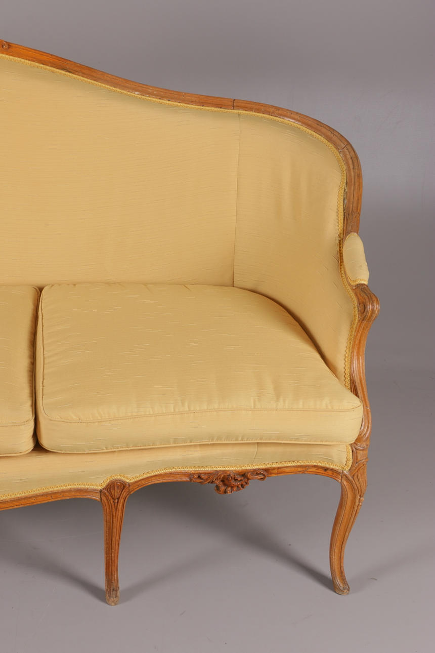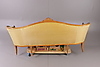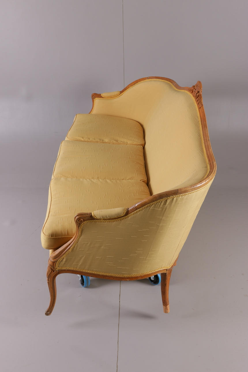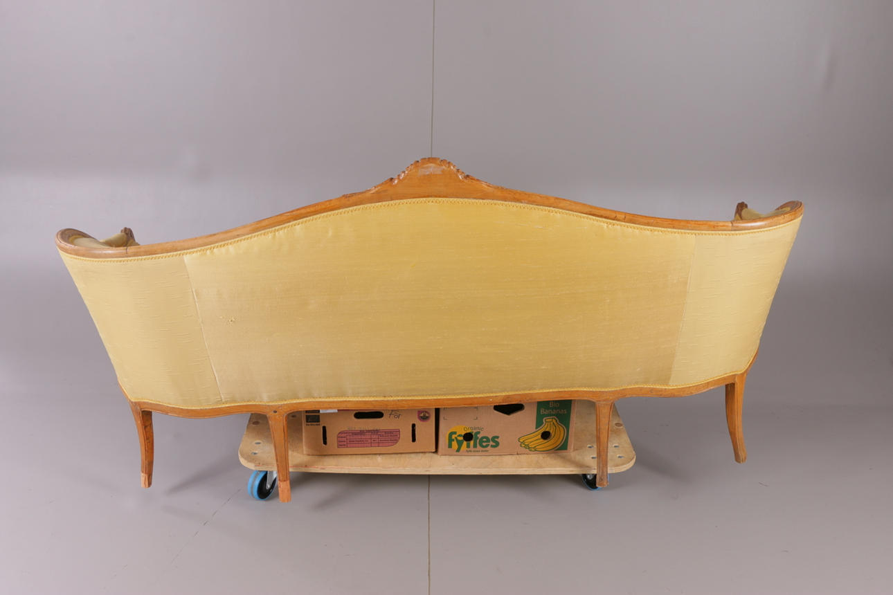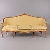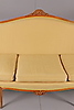Sohva rungossa leikattu kuoren ja lehtien koristelu Löysä istuinpehmo, irrotettavalla päällyksellä Pituus 200, selkänojan korkeus 110, istuinkorkeus 47, istuinsyvyys 58 cm.