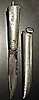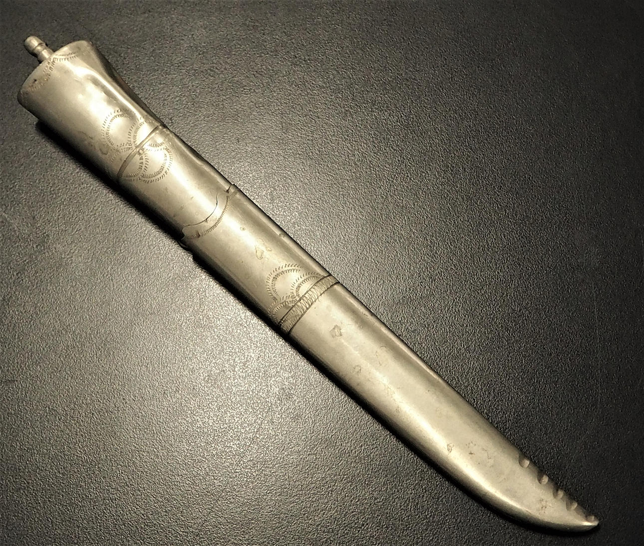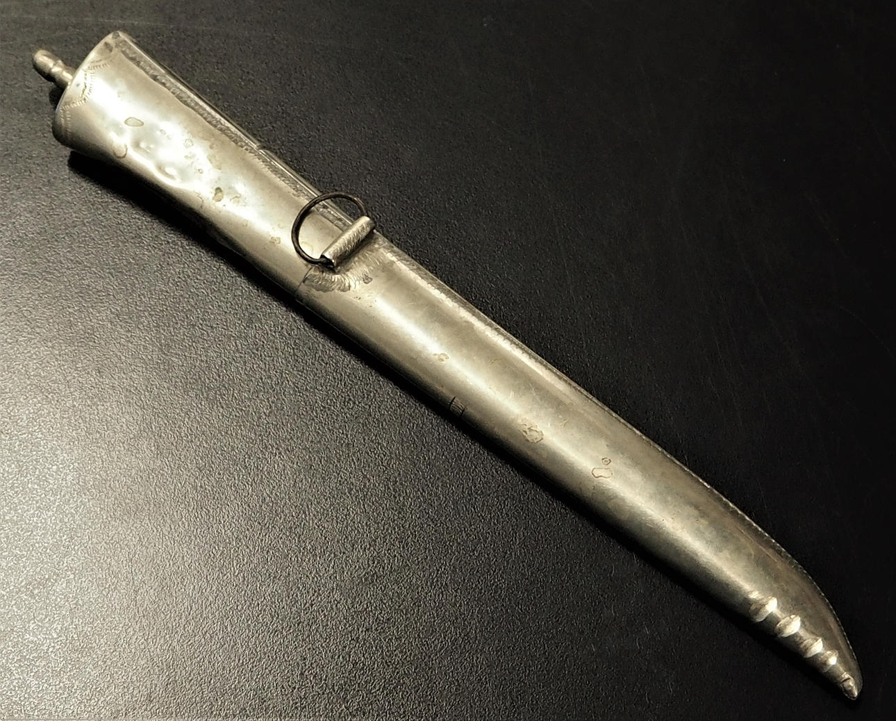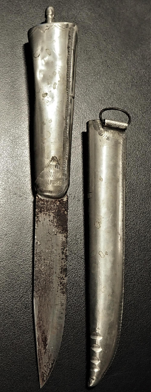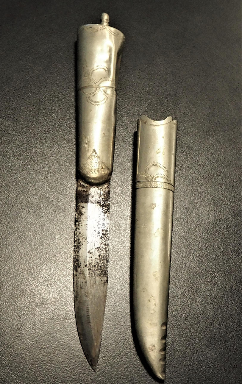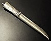 Tuppi ja varsi hopeanväristä metallia. Terästerät. Merkittäviä pakkaset, erittäin epäselvä ruosteen alla. Valmistettu Ruotsissa, Mora, Laminoitu teräs.