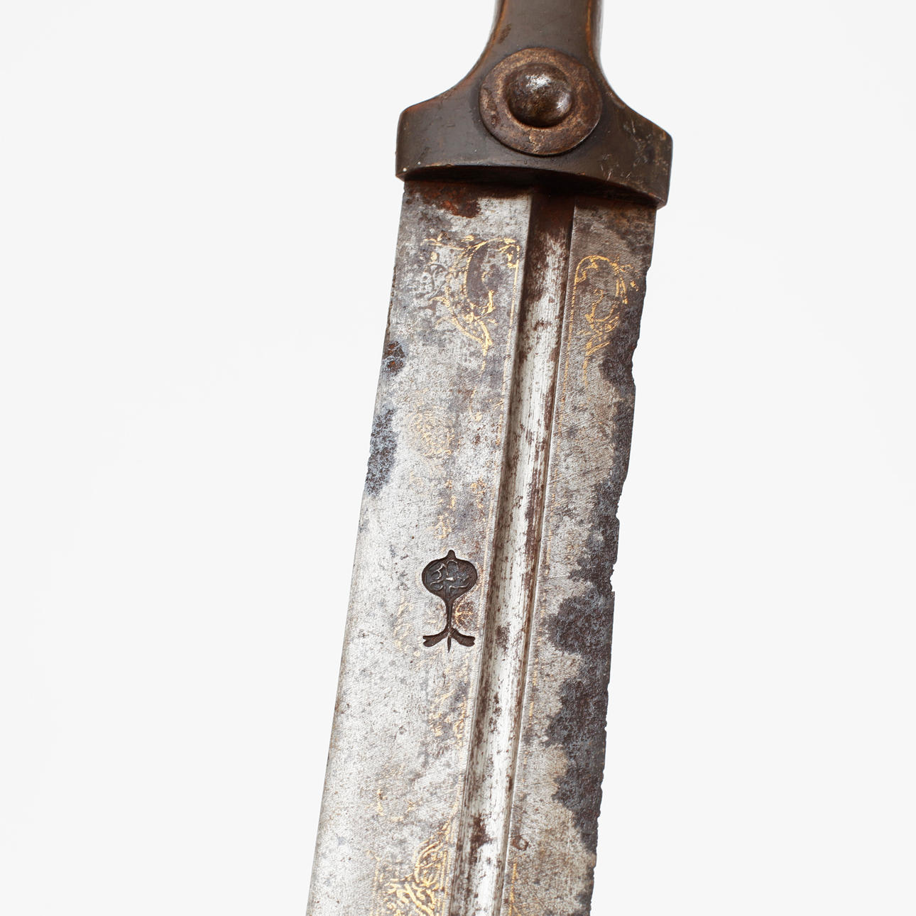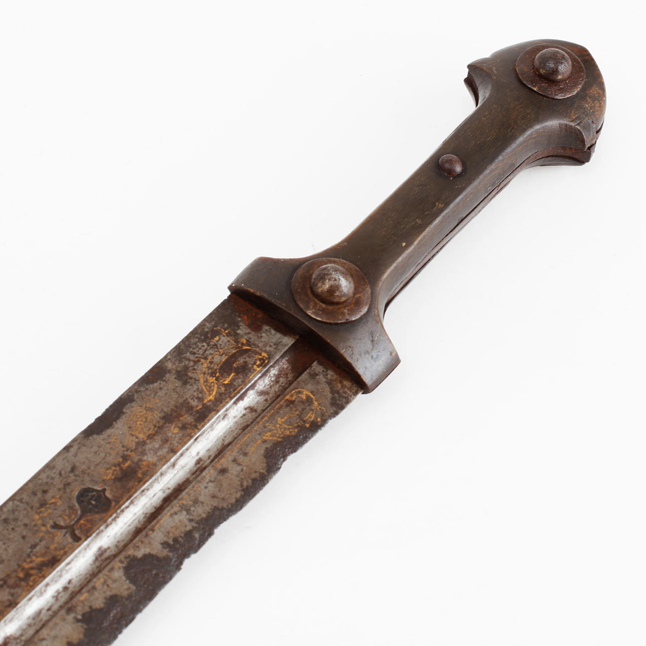 pituus 67 cm, signeerattu damastiterä, jossa sepän leima ja kullattu tekstikenttä.