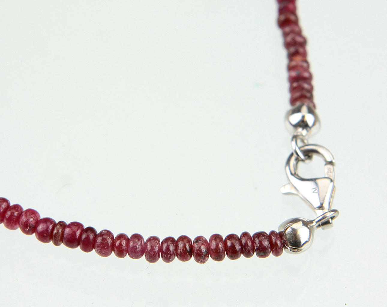 Kaulakoru on valmistettu luonnollisista rubiinirondelleista, joissa on kiillotettu pinta. Hummerilukko hopeaa 925.