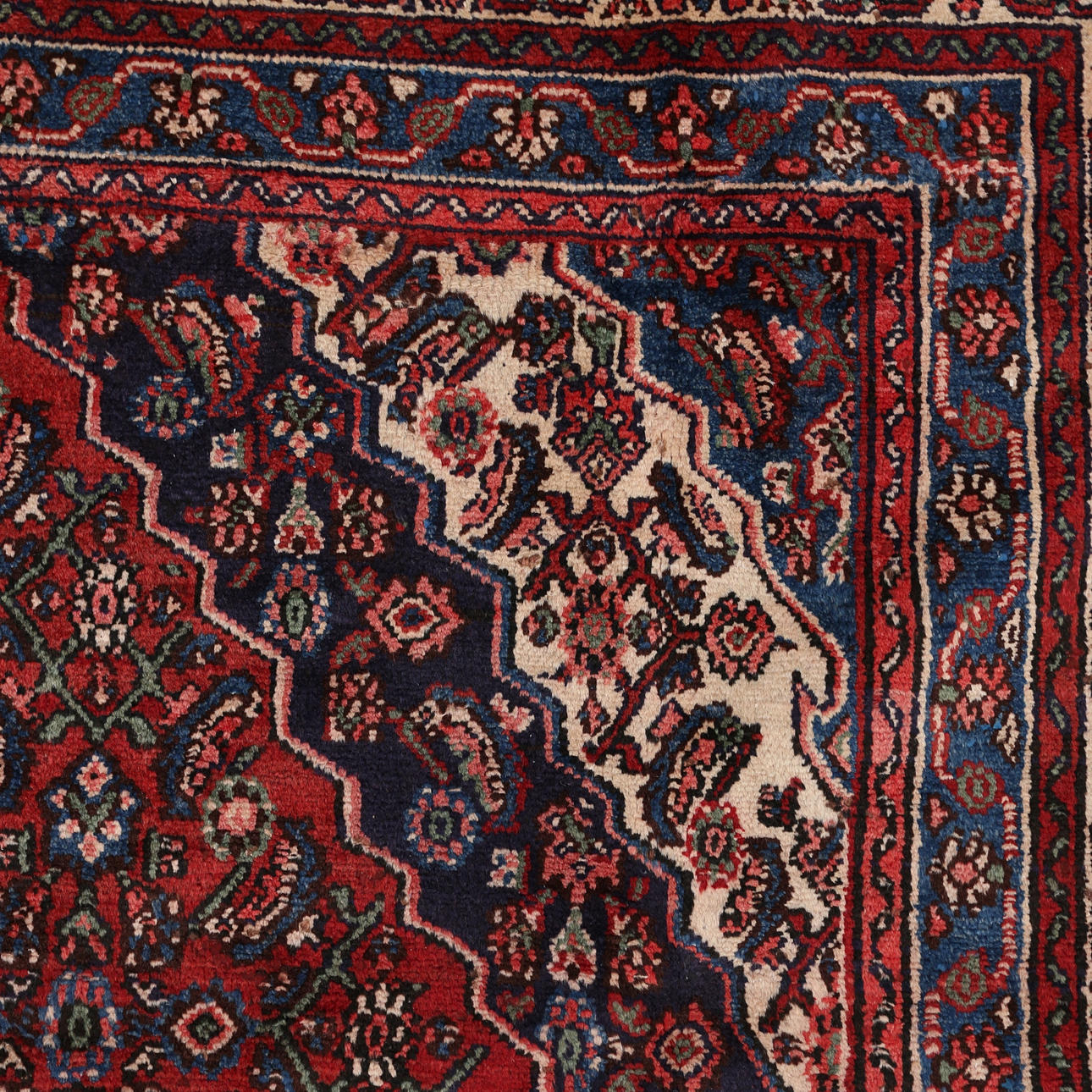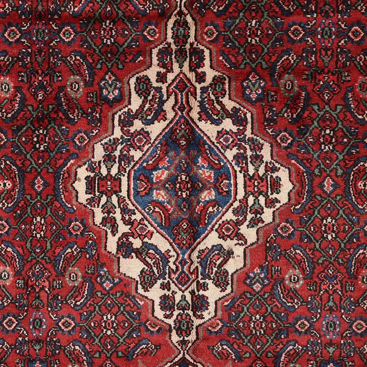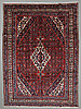 Käsinsolmittu persialainen villamatto puuvillaloimella, Hamedan. Linssin muotoinen medaljonki heratikuvioisella punaisella pohjalla.