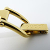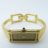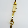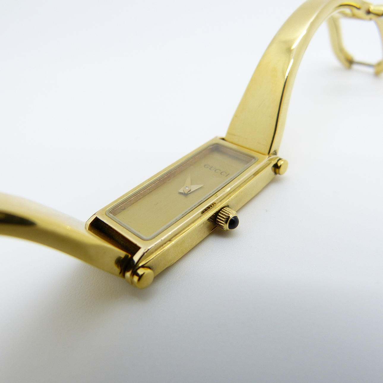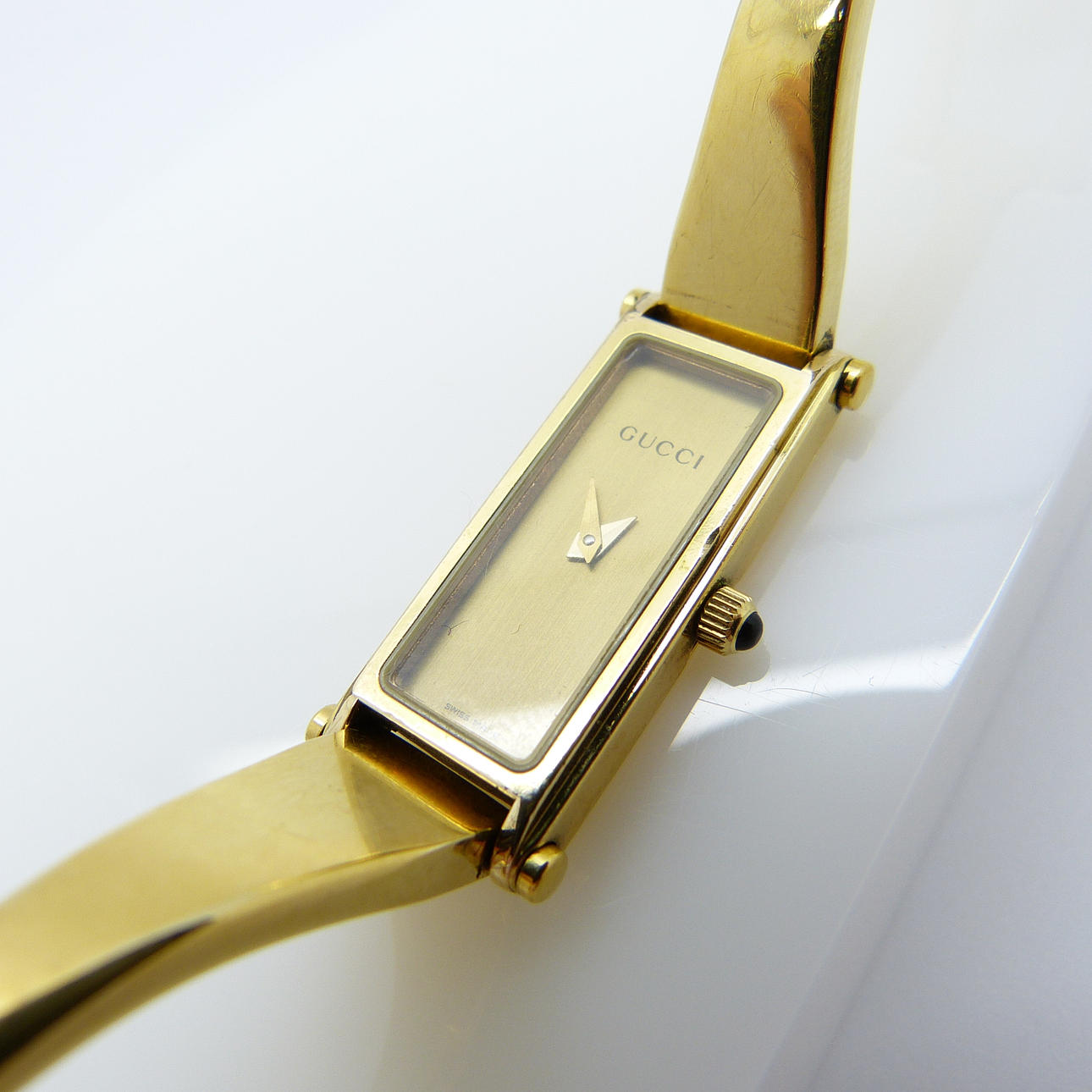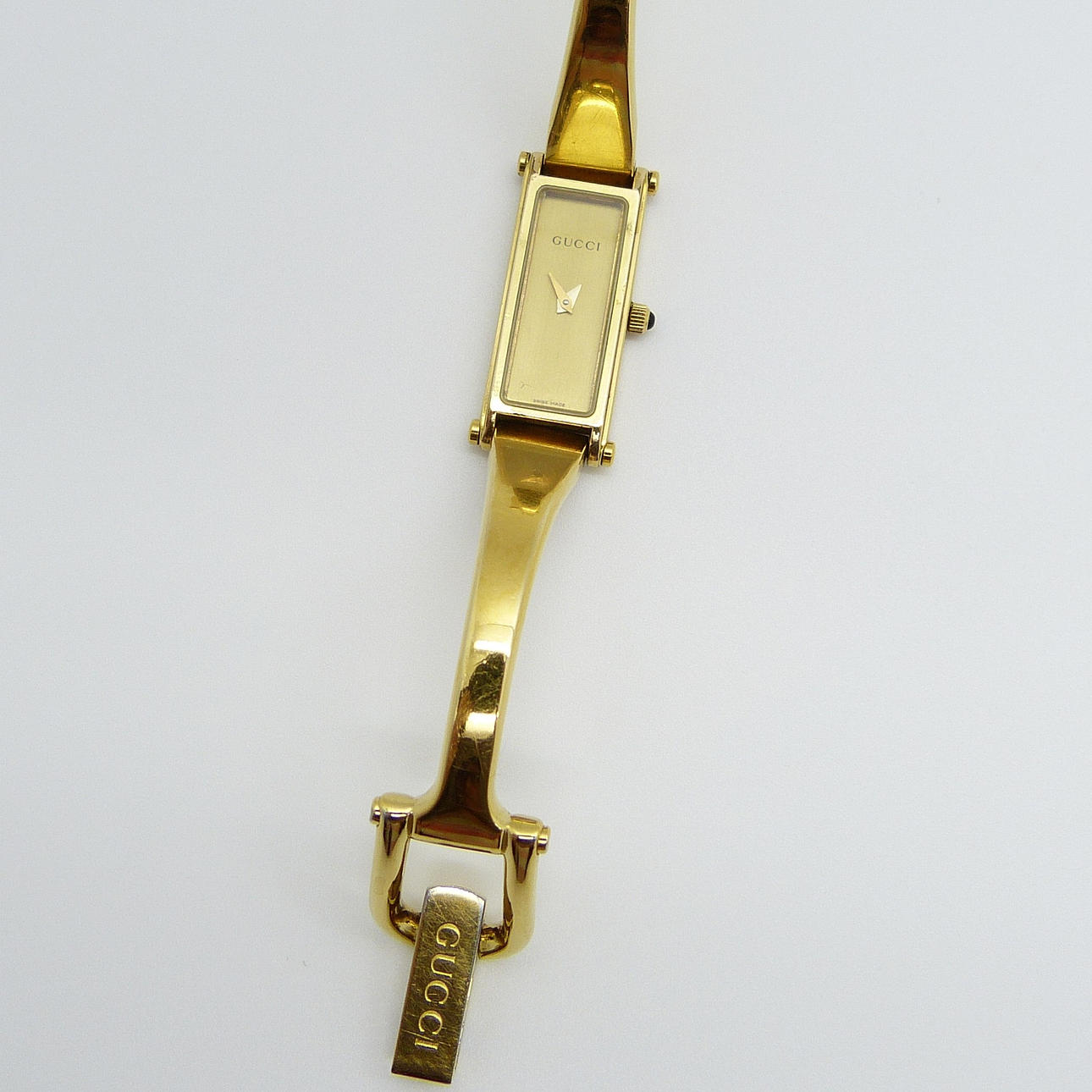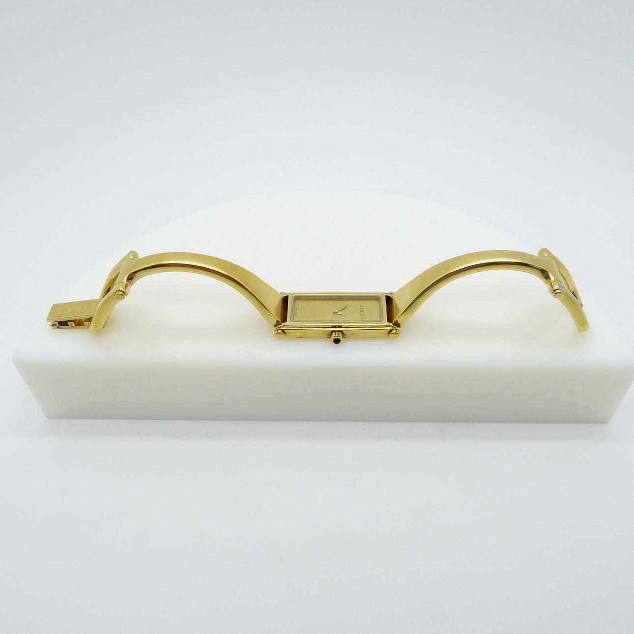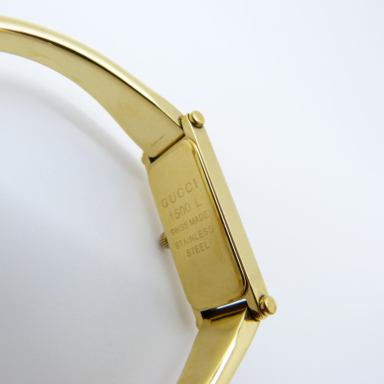 Tekniset tiedot: • Merkki: Gucci • Liike: Kvartsi • Materiaali: Ruostumaton teräs, kullanvärinen viimeistely • Kotelon mitat: 30 x 12 x 4 mm, n. • Etupuoli: samppanjanvärinen, minimalistinen • Kellotaulu: kullanvärinen. Vain tunti- ja minuuttiosoittimet • Hihna: Ranneke, pienin koko • Kiinnitys: Taita ympäri turvalukolla • Kotelonro.: 1500L Kokonaispaino: 26,6 grammaa.