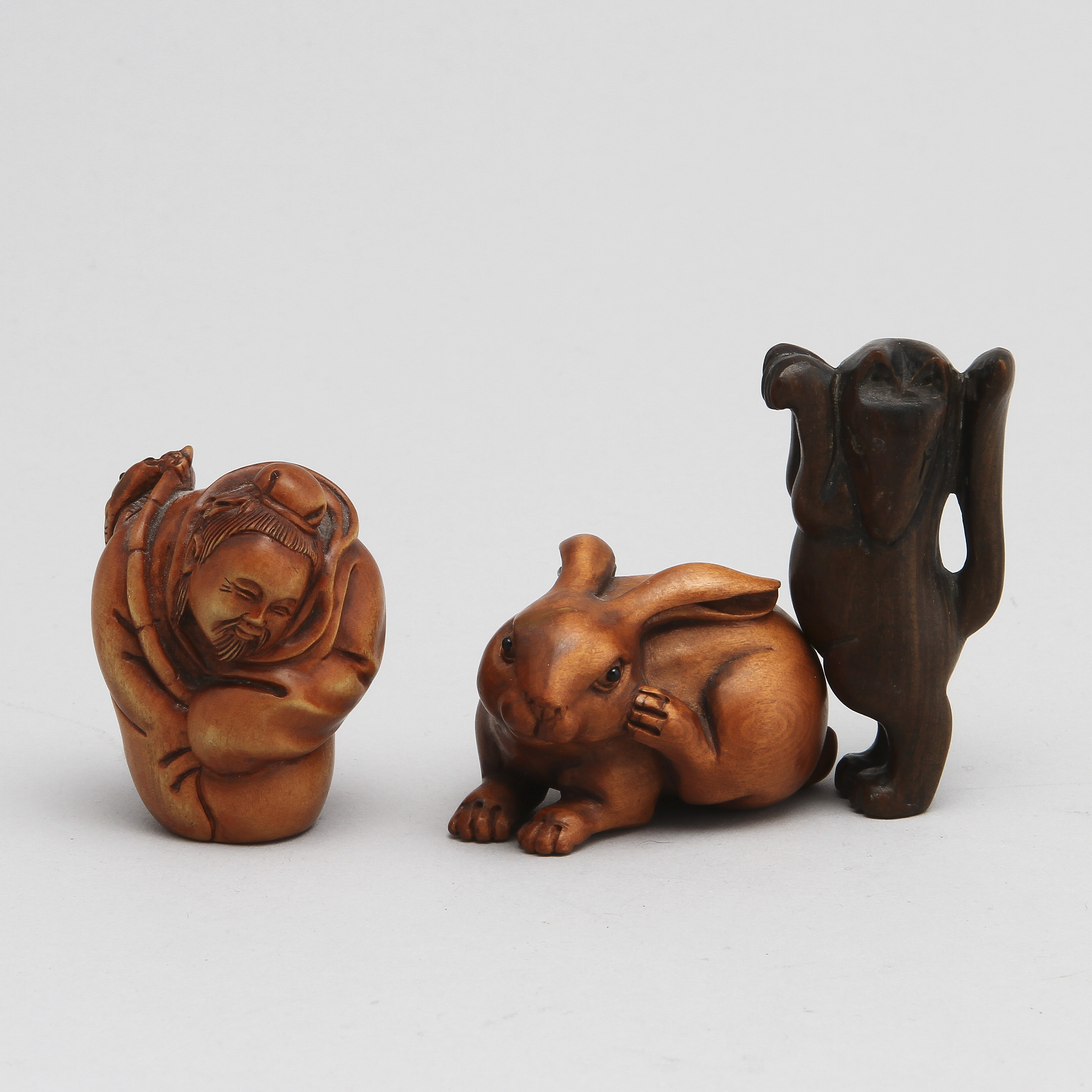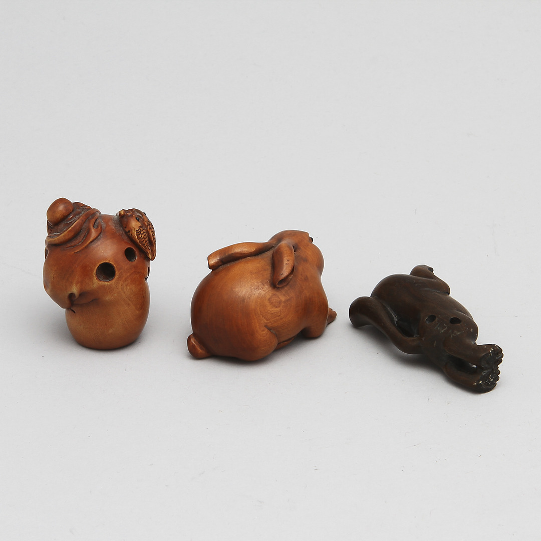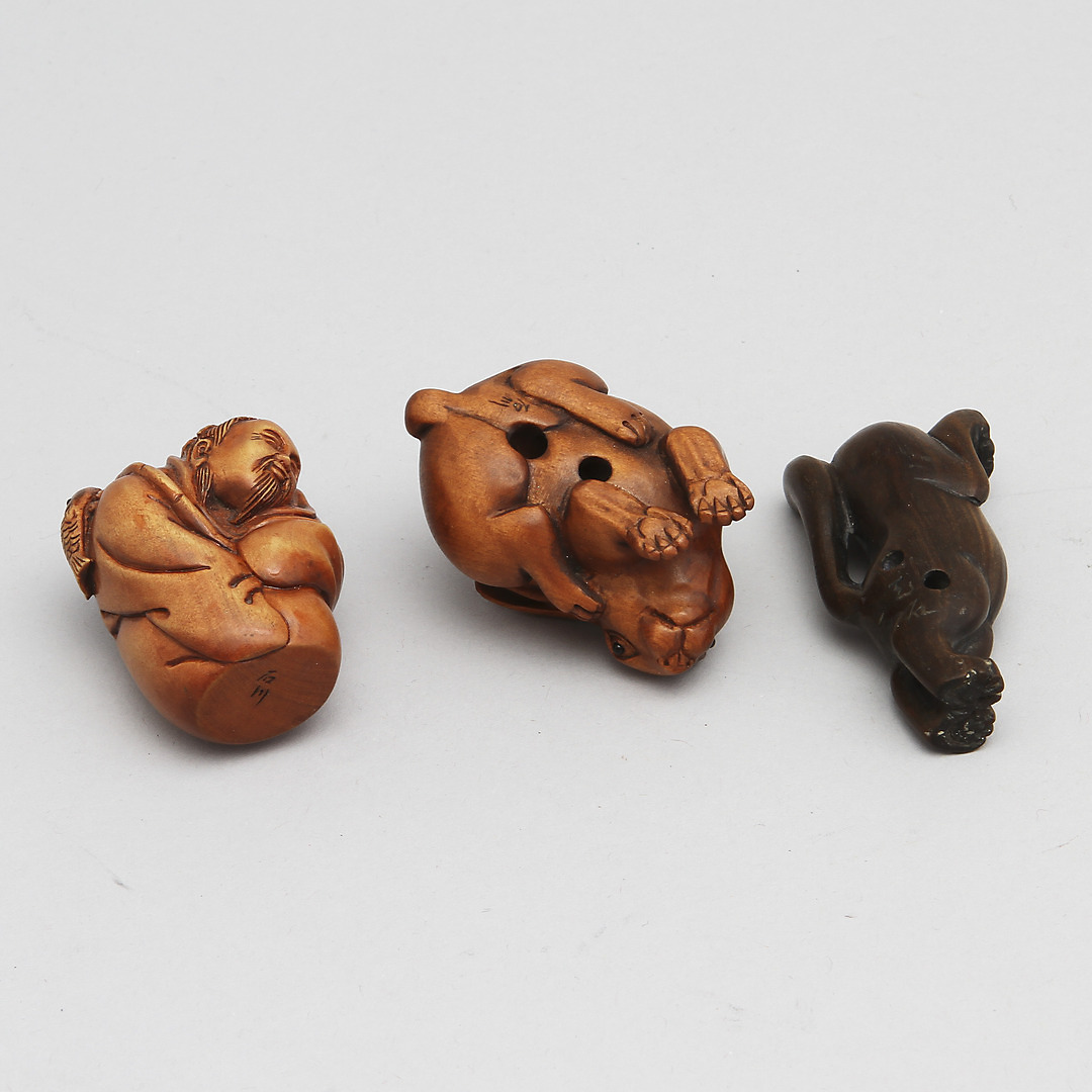 128123. NETSUKE, 3 kpl, puu, Japani, 1900-luku.