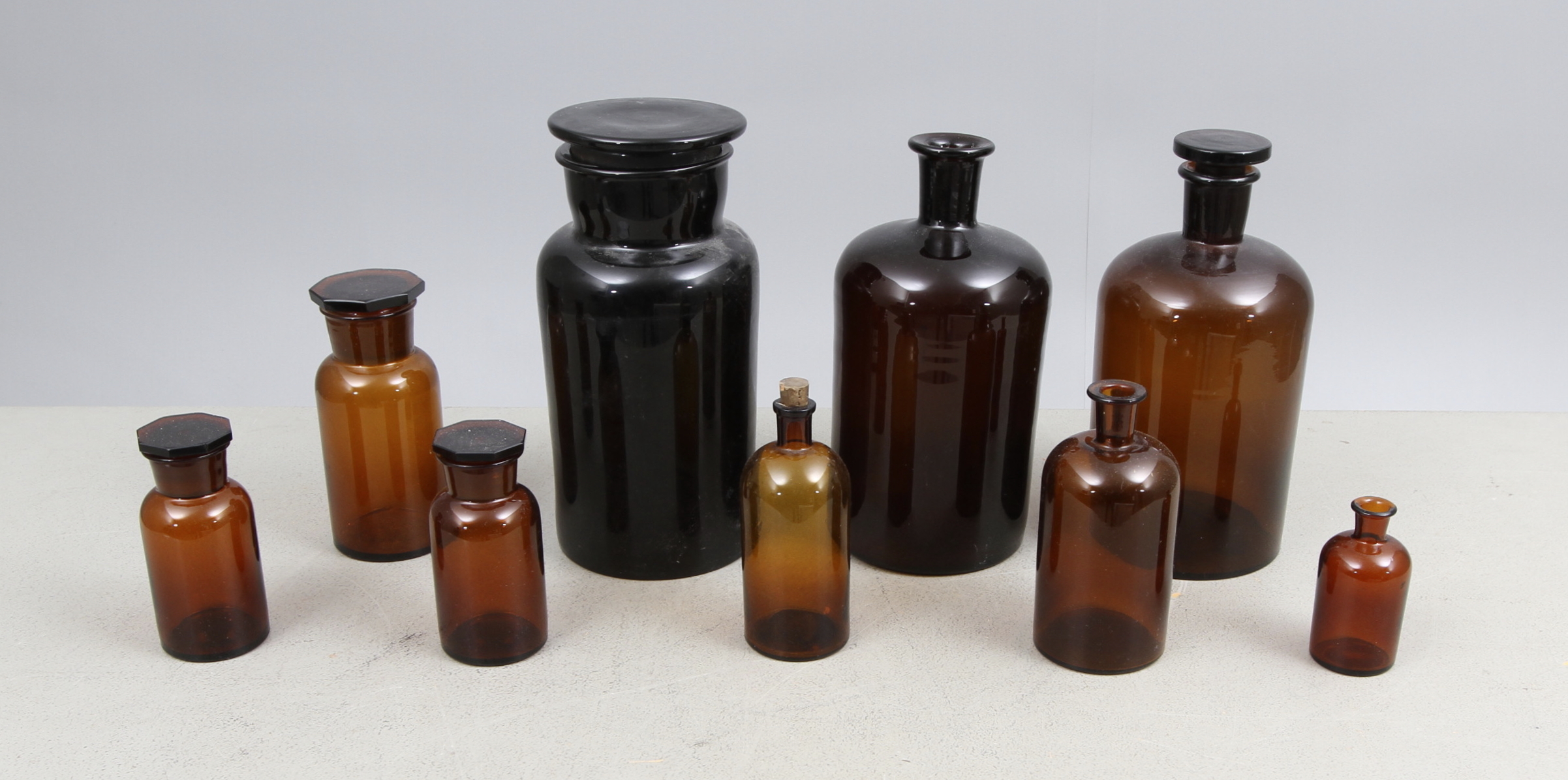 130340. APTEEKITÖLKIT / PULLOT, lasia, 9 osaa, 1900-luku.
