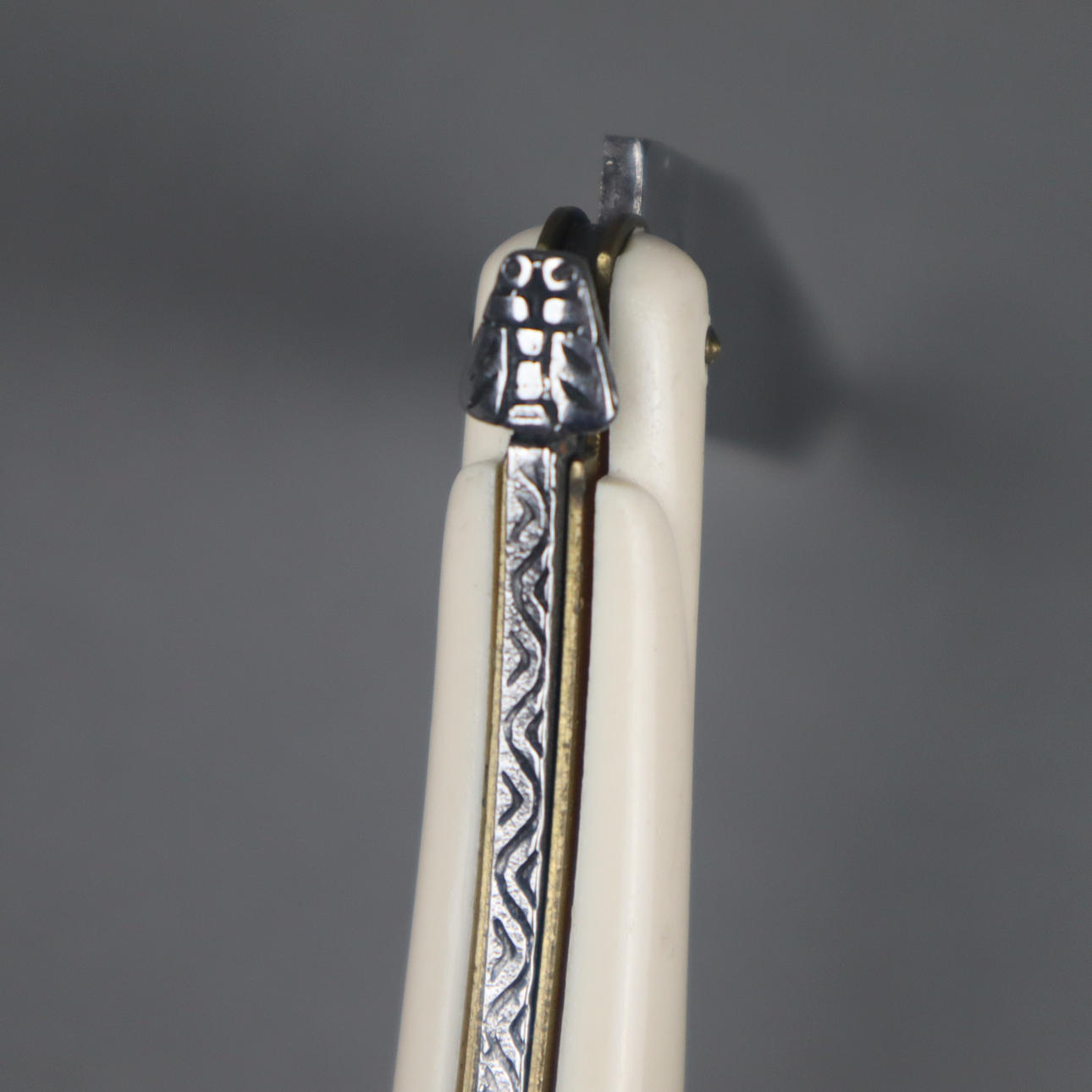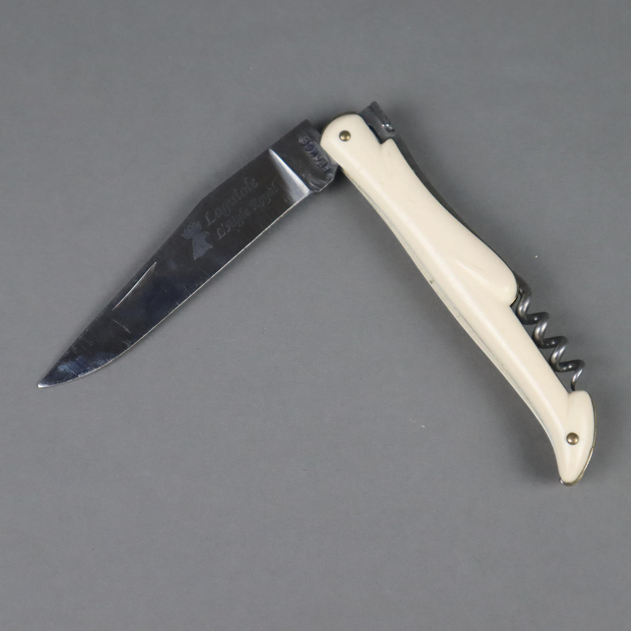 "Laguiole L'Aigle Royal", norsunluun kahvan jäljitelmä vaa'at, korkkiruuvi, taitettava terästerä, pituus n. 11 cm, pituus taitettuna n. 20 cm.