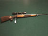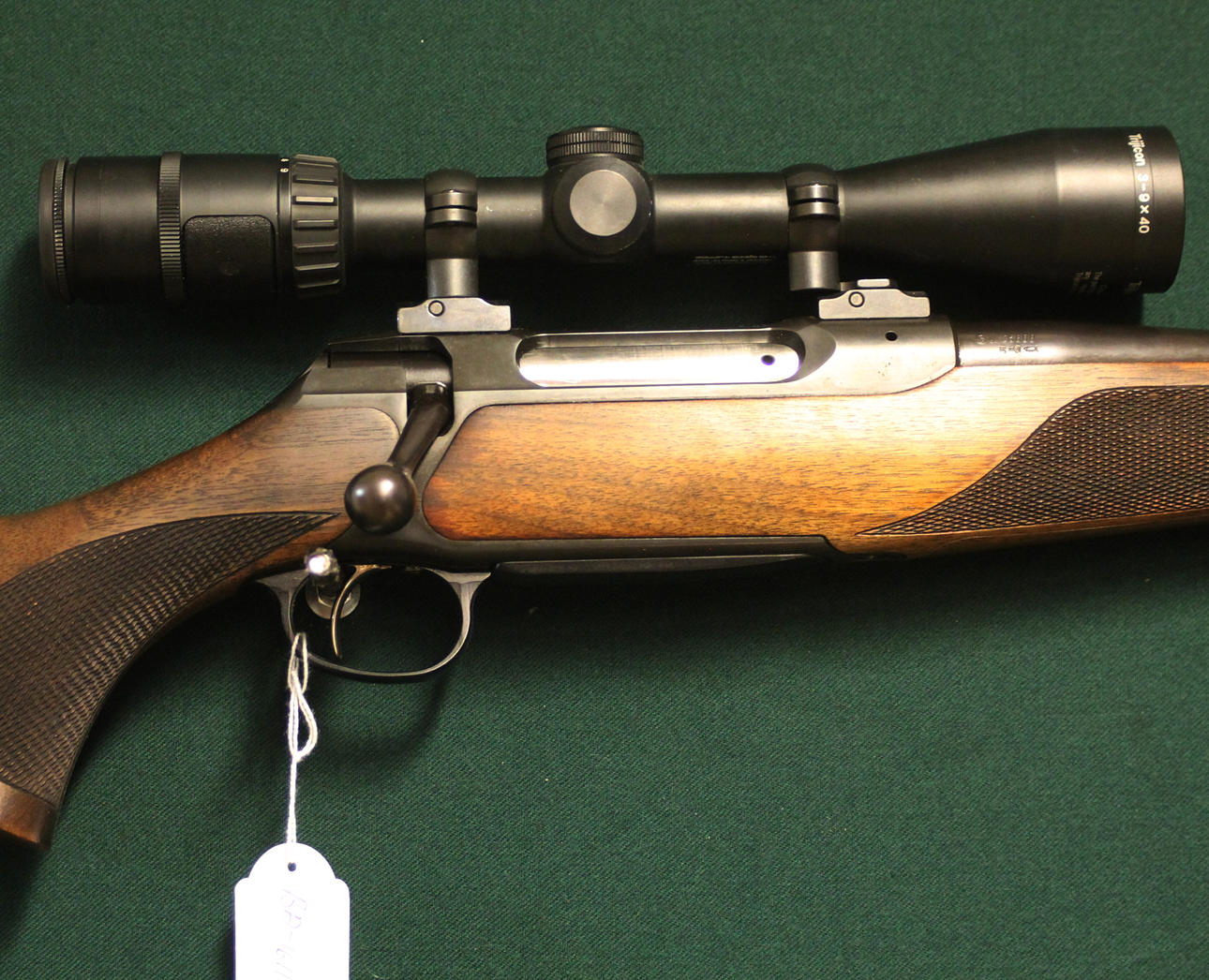 piipun pituus 56,5 cm, puinen kanto, kumi takakansi, trijicon 3-9x40 asennettuna leupold QR -telineisiin.