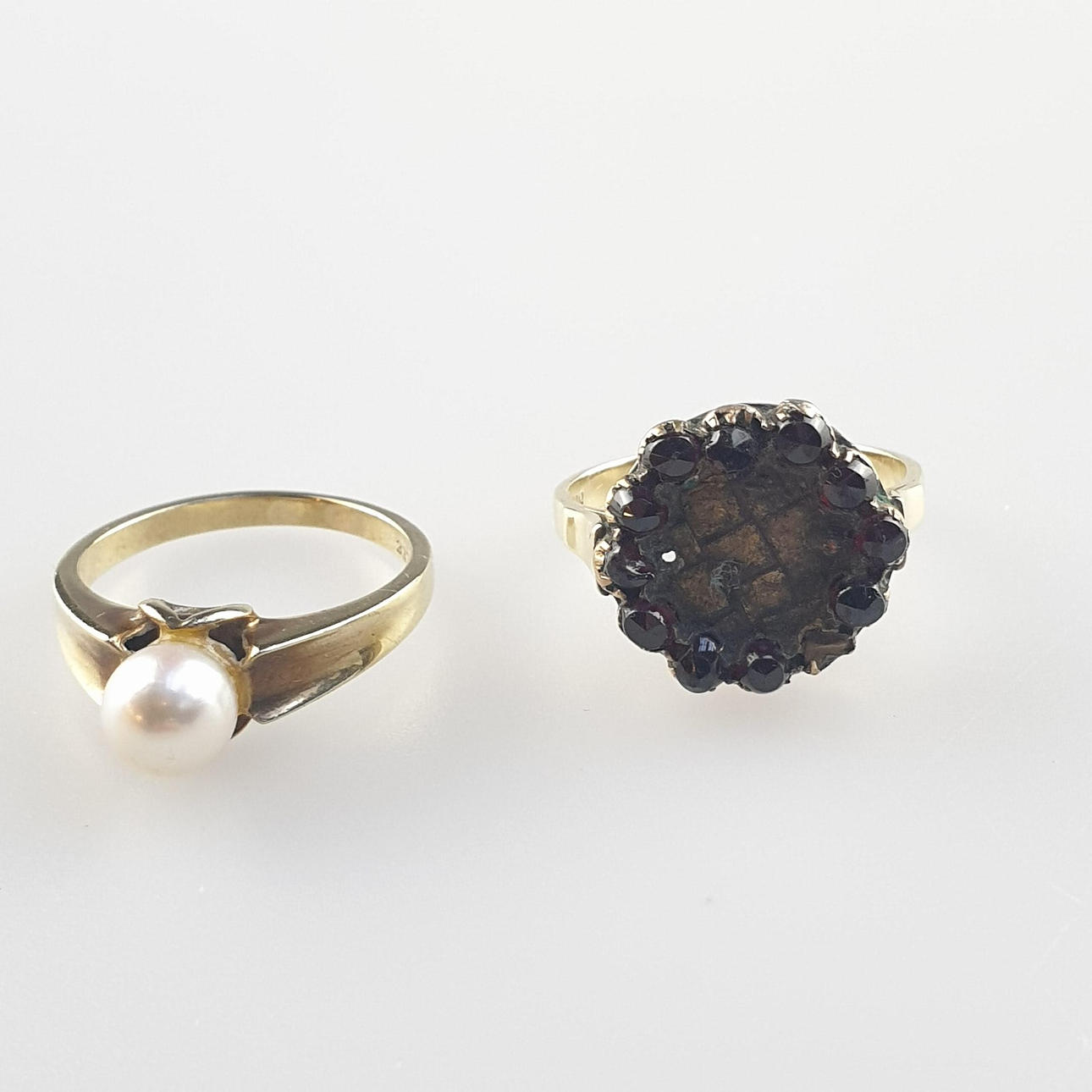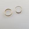 1 sormus 585 keltakullasta, jäljellä 11 granaattia, loput kivet poistettu, sormuksen pään halk. Noin 15 mm, sormuksen koko 60, n. 4,3 g/ 1 vihkisormus 585 keltakullasta, setissä 1 pieni timantti n. .2,85 g/ 1 helmisormus, 333 keltakulta, luultavasti keinohelmi, liiman jälkiä, sormus koko 59, n. 3,4 g / 1 sormus, jossa 4 viisteistä zirkoniakiveä, 333 keltakulta, sormuskoko 54, n. 0,78 g, sormusnauha hieman vääntynyt.