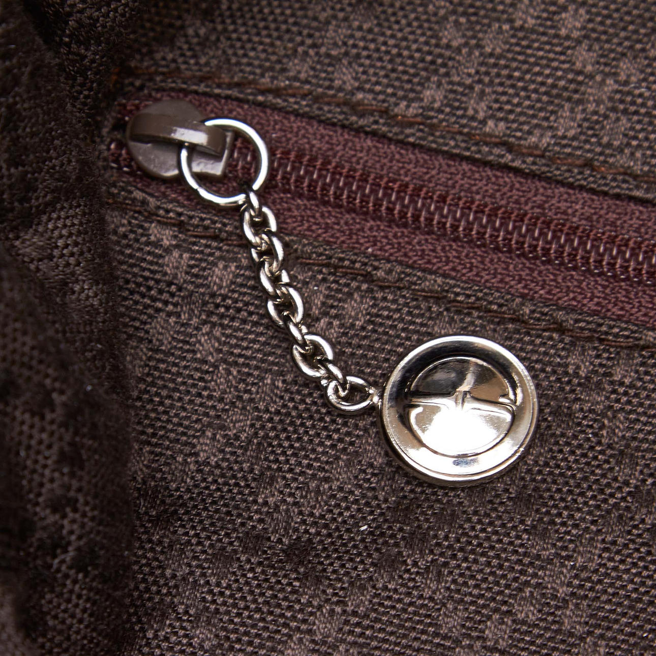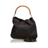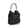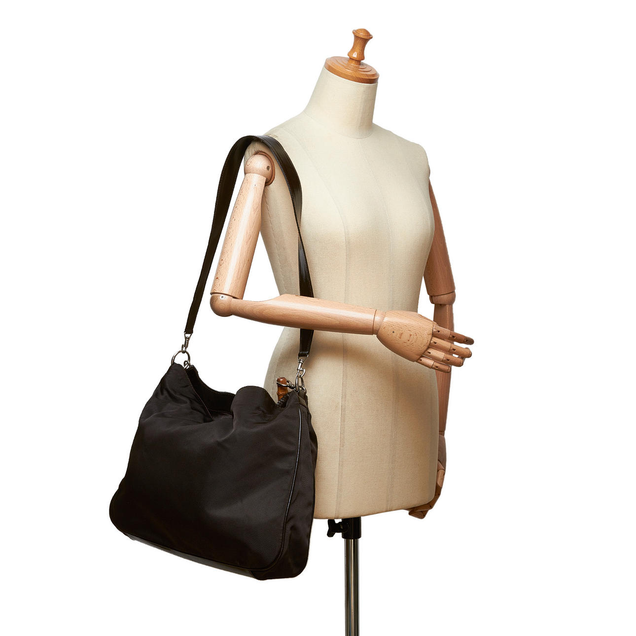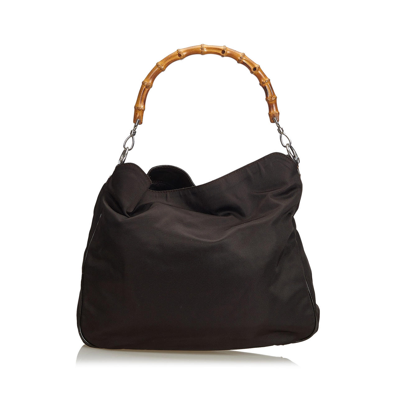 Kangas. Bambu kahva. Sisätaskut, joista yhdessä vetoketju. Irrotettava nahkainen olkahihna. Laukun korkeus ilman kahvaa n. 32 cm. Leveys noin 37 cm. Syvyys noin 10 cm. Sarjanumero: 001-2123-1577.
