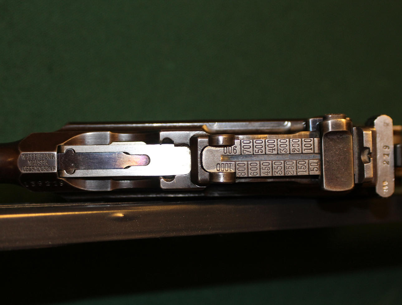 Valmistusnumero: 139219 Piipun pituus 14 cm Siniväriset, puiset kädensijat, merkintä Waffenfabrik Mauser Oberndorf A. Neckar. Pistoolin sarjanumero oikea.