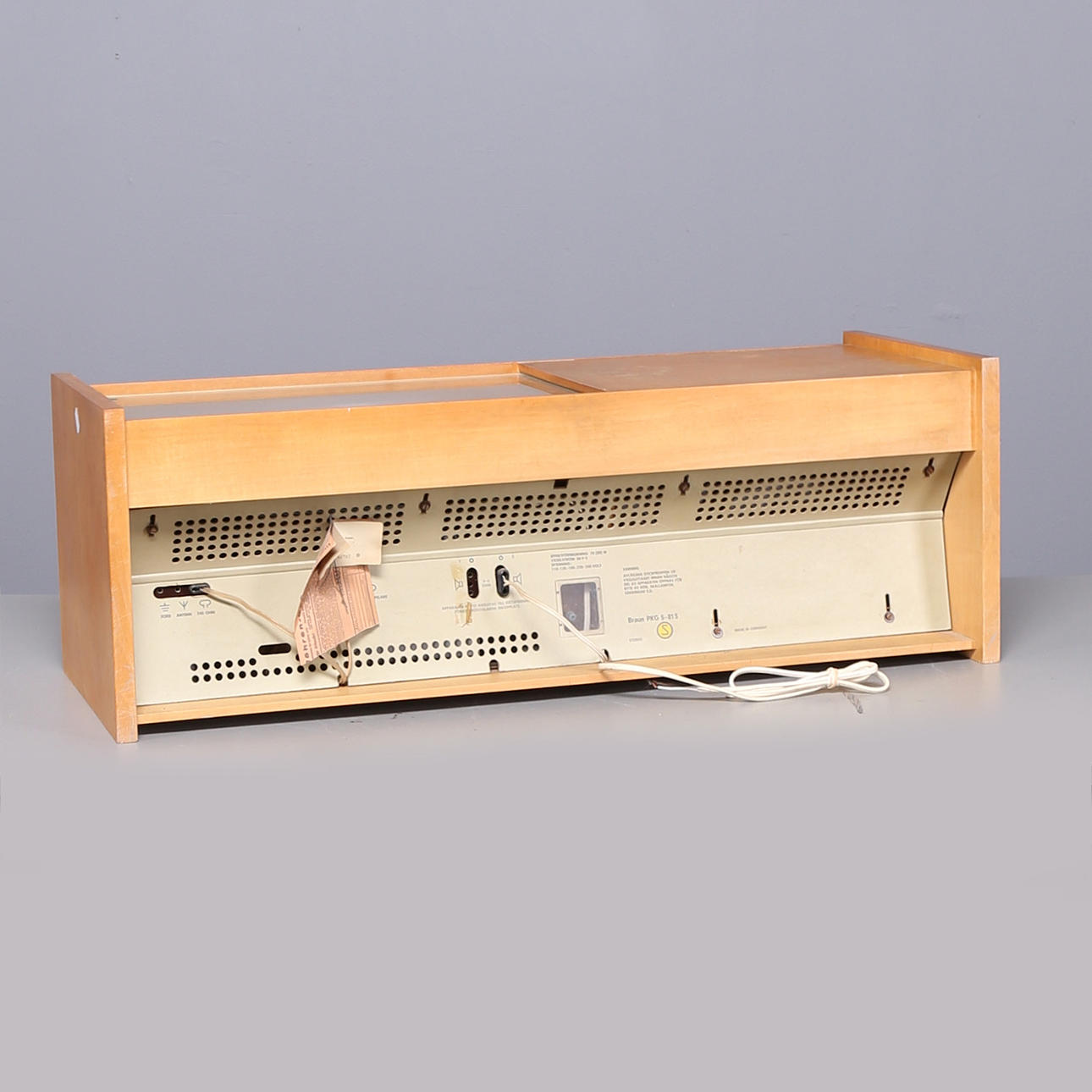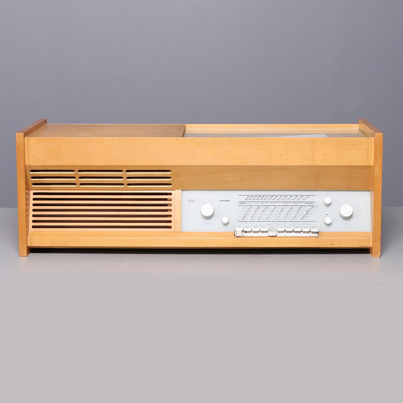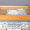 Hans Gugelotin suunnittelema Braun PKG 5-81 S -radio- ja gramofonijärjestelmä. Mitat: pituus 95, korkeus 33, syvyys 36 cm.
