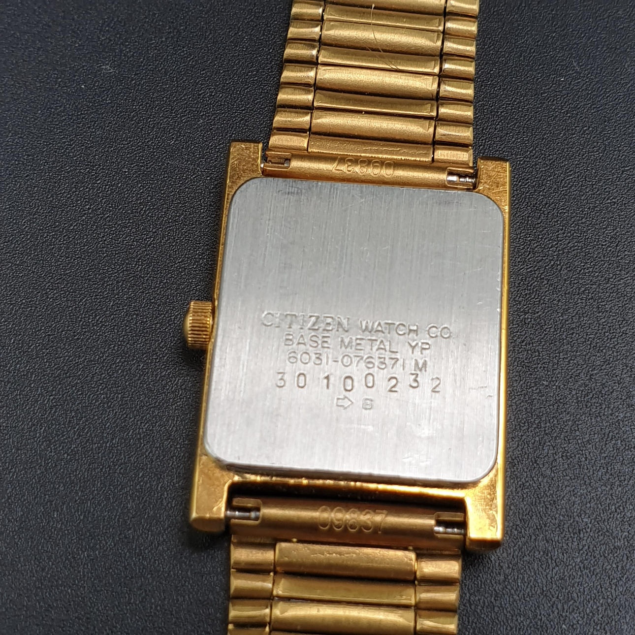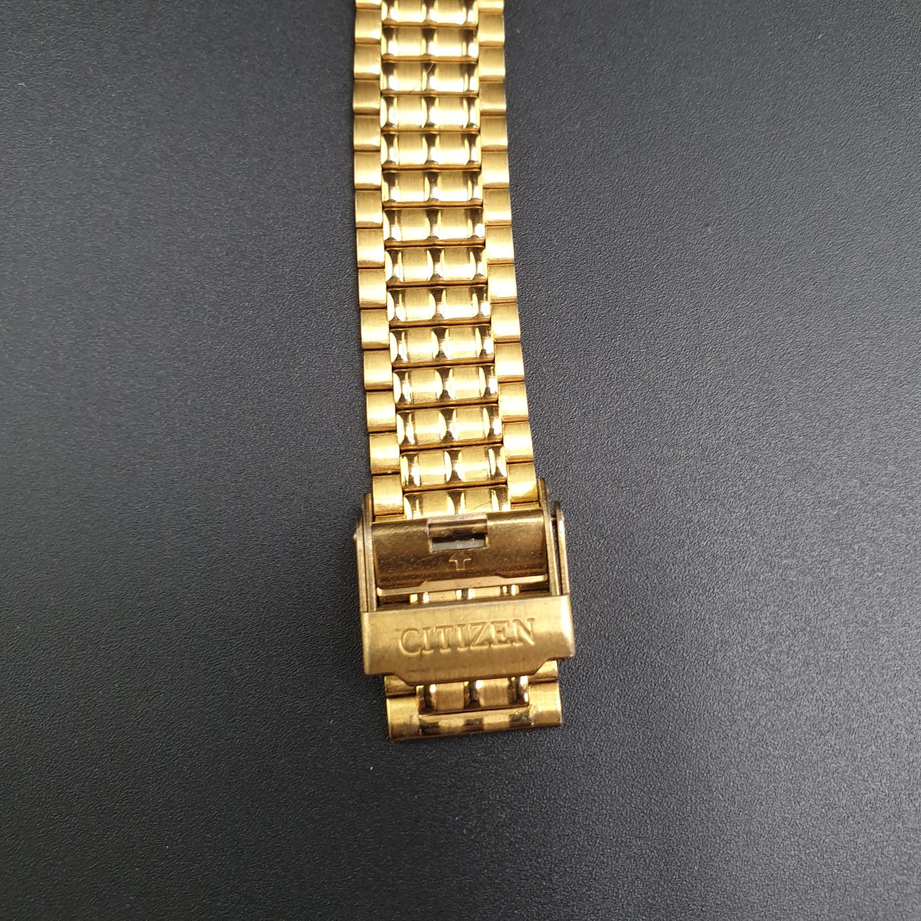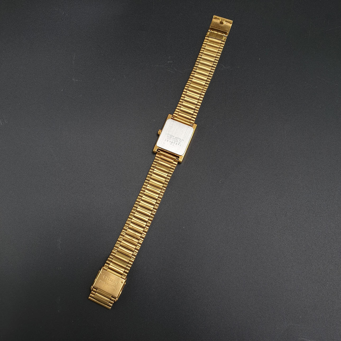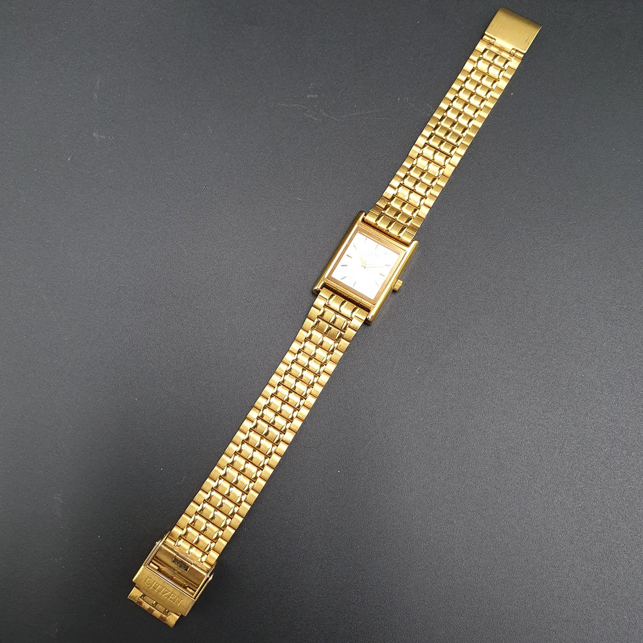 Vintage RANNEKELLO Citizen - suorakaiteen muotoinen metallikotelo, kullattu, kvartsia, kirkas kellotaulu kullatulla indeksillä ja yksinkertaisilla osoittimilla, kotelo n. 24x21mm, leveys n. 21cm.