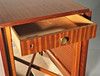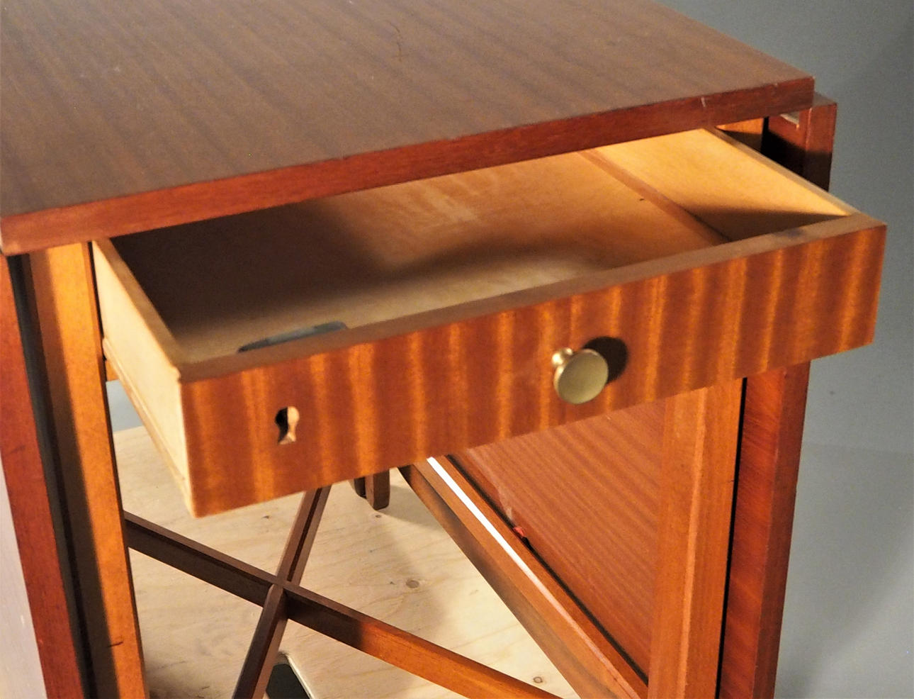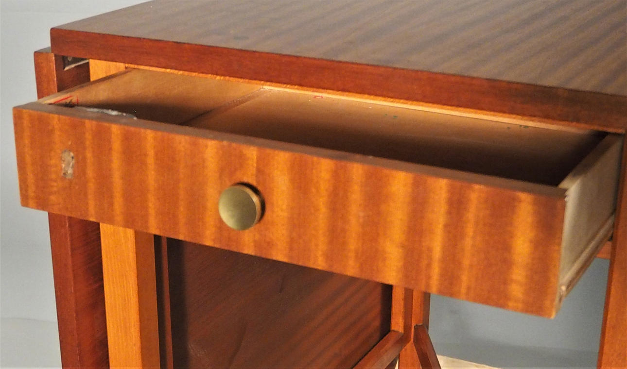 Korkeus noin 75 cm, pöytä 50 cm, veto 68 cm x 2, kokonaispituus 186 cm, leveys noin 82 cm. 2 laatikkoa helmassa. Pyöristetyt kulmat vedoissa.