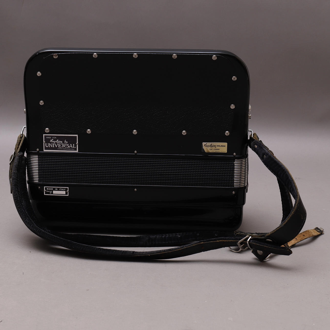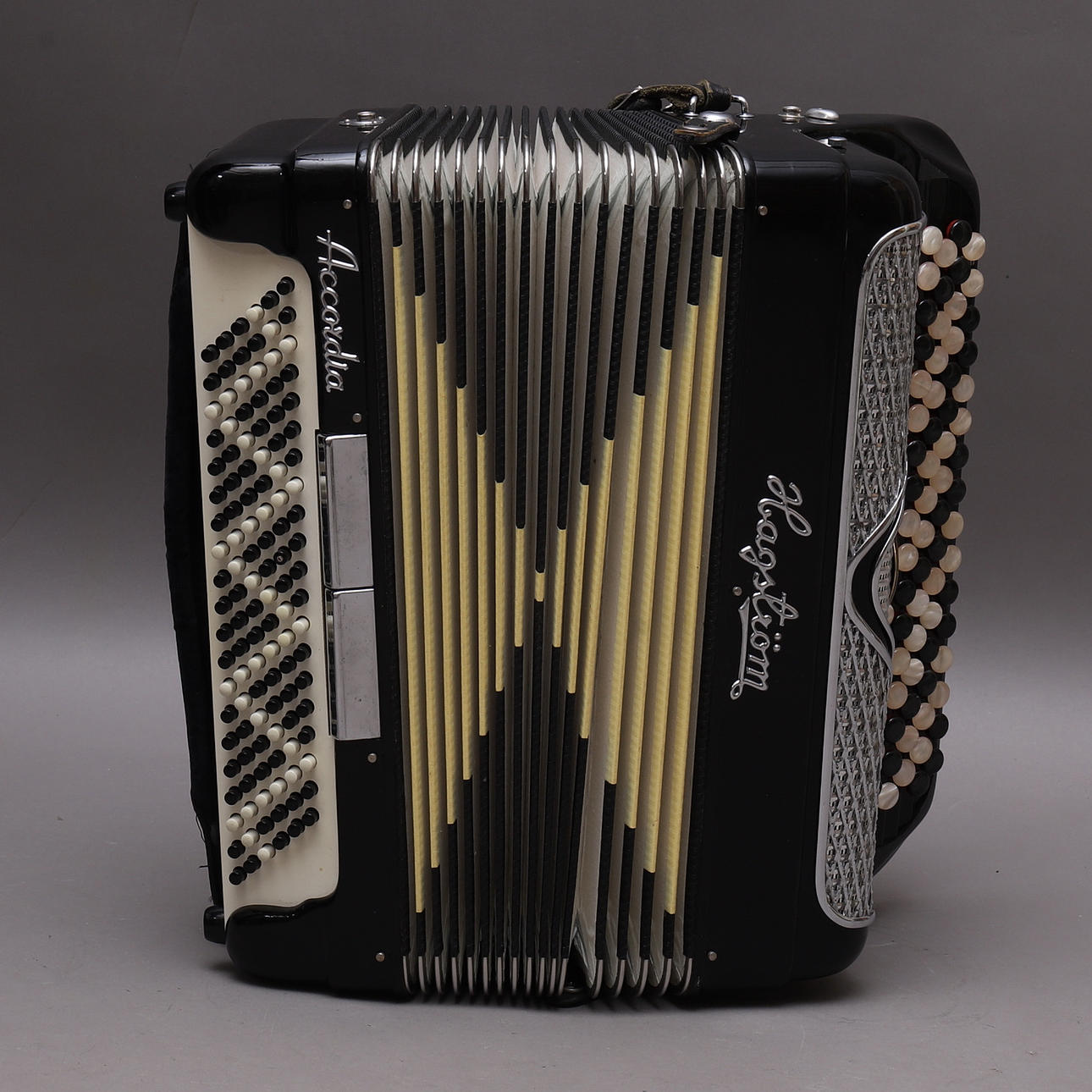 Soitettavassa kunnossa oleva harmonikka. Käyttöehto. Laukku, jossa kulumaa.